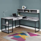 Open and closed storage options include 2 fixed, open shelves on one side, 1 wide storage drawer with a black metal handle and a metal drawer on glides under the main desktop.
