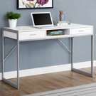 Its spacious white top, includes two drawers accented with silver handles to store notebooks, books or office supplies.