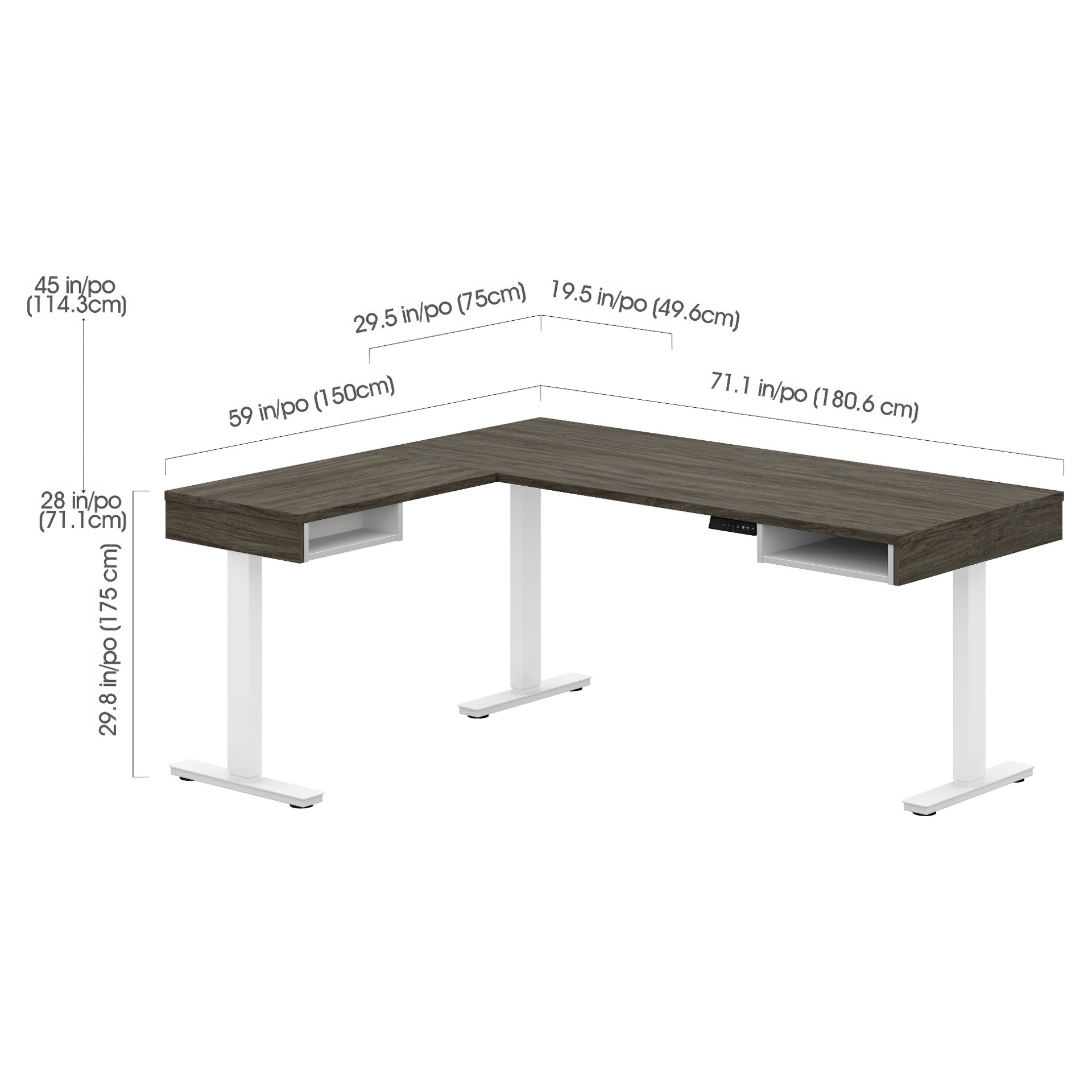 MADE IN QUEBEC: 2 people are required for assembly. 71. 1" W x 80.3" D x 28-45" H. Adjustable white lacquered steel legs. Fully reversible unit. The desk meets or exceeds ANSI/BIFMA safety and performance standards.