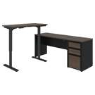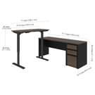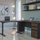 This contemporary, durable collection will fit your specific needs with its multiple configuration possibilities. Its extraordinary style at an affordable price will charm you. The electric mechanism allows you to quickly and quietly adjust the height of the table from 28" to 45". Sturdy work surfaces are made of commercial grade melamine with a thickness of 1/8". The control knob located on the front edge of the work surface allows you to choose the height of the table. 110V electric mechanism. Deluxe PVC edges. Meets or exceeds ANSI/BIFMA commercial quality and safety standards. Fully reversible. Grommets for cable management. Two utility drawers and one file drawer with letter/legal filing system. Drawers on ball bearing slides. The bottom two drawers are lockable. Assembly required. L-shaped desk: 71. 1 x 70. 9 x 30. 4. Credenza: 71. 1 x 22. 4 x 30. 4. Adjustable table: 47. 6 x 24 x 28 to 45. 10 YEAR LIMITED WARRANTY: A warranty against defects in materials and workmanship is extended to the original purchaser.