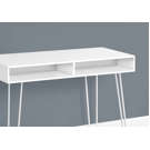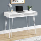This modern white finished desk has matching metal hairpin legs for a sleek, retro look.