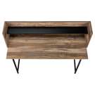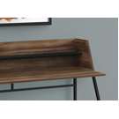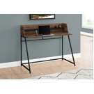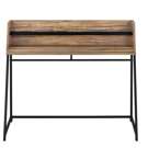 Look at your home office from a different angle with this computer desk featuring a storage hutch. Finished in a brown reclaimed wood-look laminate, the compact desktop has side panels that slant to seamlessly align with the attractive, trapezoid-shaped metal legs for a clean look.