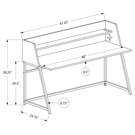 Supporting the desktop is a sturdy metal base in black with a support bar on back that runs parallel to the shelf.