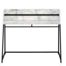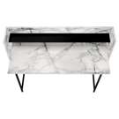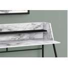 Look at your home office from a different angle with this computer desk featuring a storage hutch. Finished in a white marble-look laminate, the compact desktop has side panels that slant to seamlessly align with the attractive, trapezoid-shaped metal legs for a clean look.
