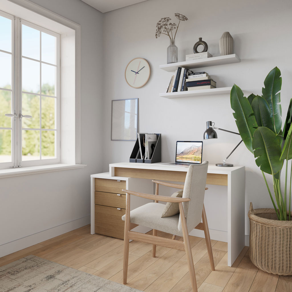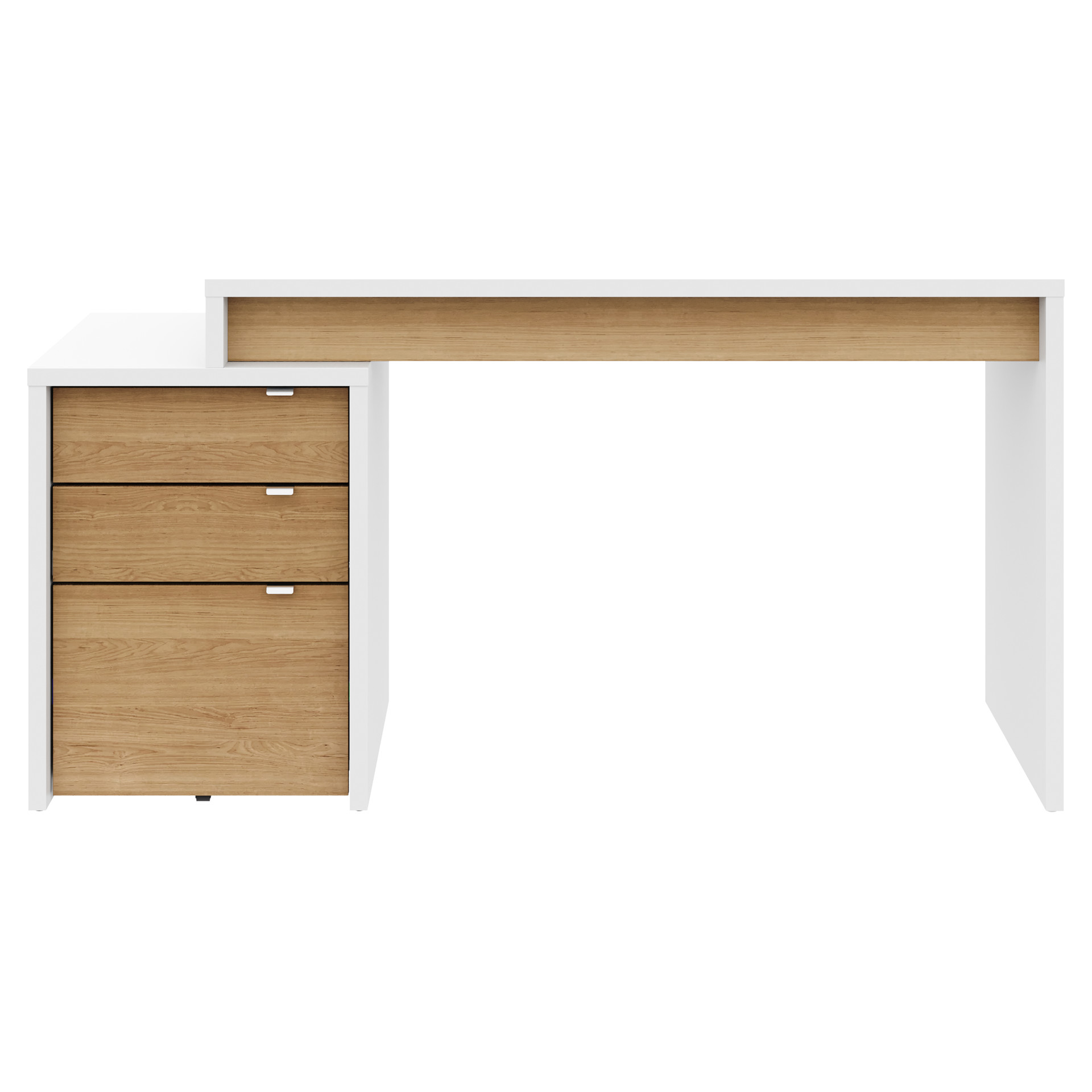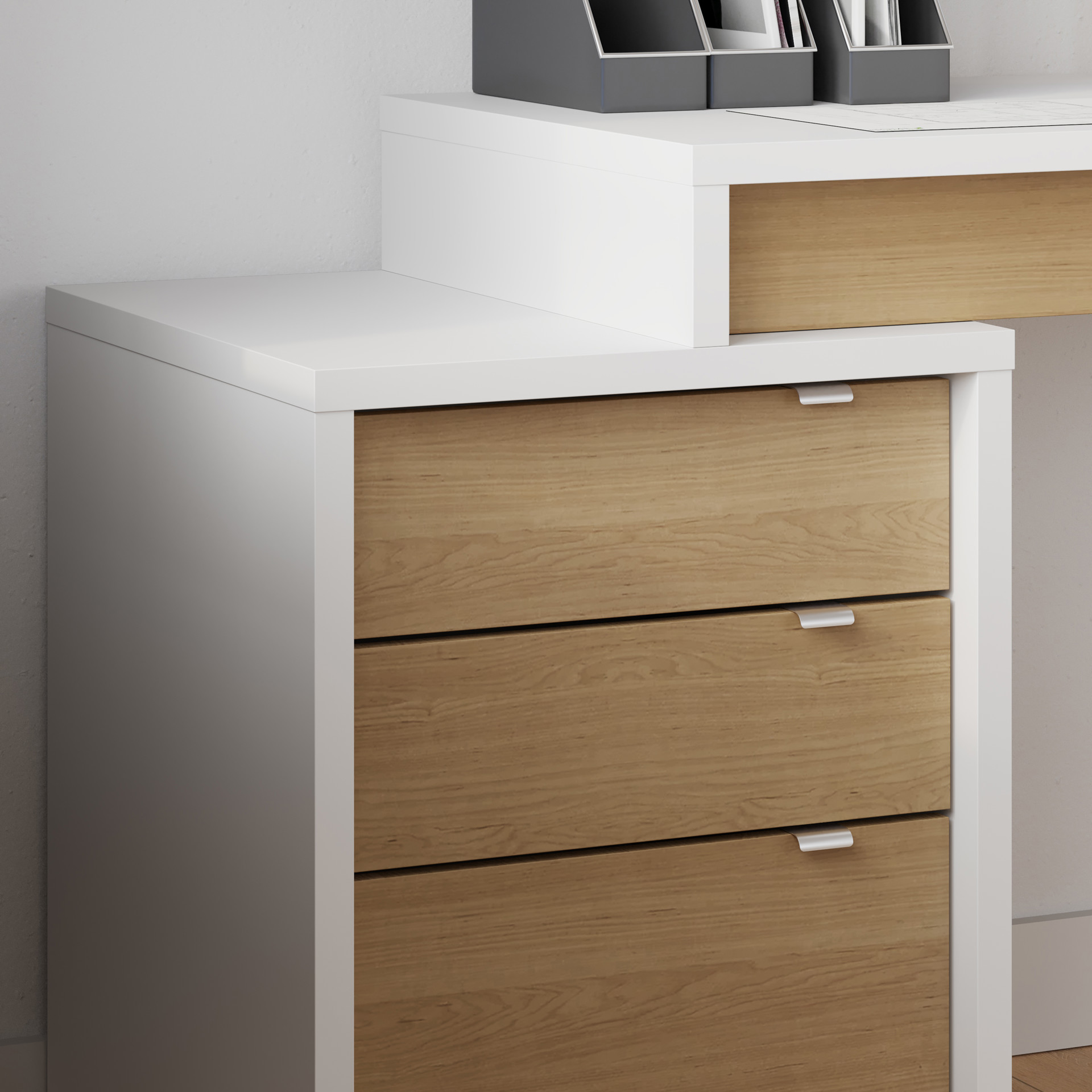 Young and refreshing, Nexera's Chrono collection has it all; its modern white finish with rich natural maple accents and flexible design allow you to create your own on-trend office corner. Chrono set #400921 includes reversible work surface and 3-drawer filing cabinet (211339, 211239). 2 work surfaces can be installed on the Chrono filing cabinet to create a 2-person workspace. The filing cabinet features a legal-size file drawer.