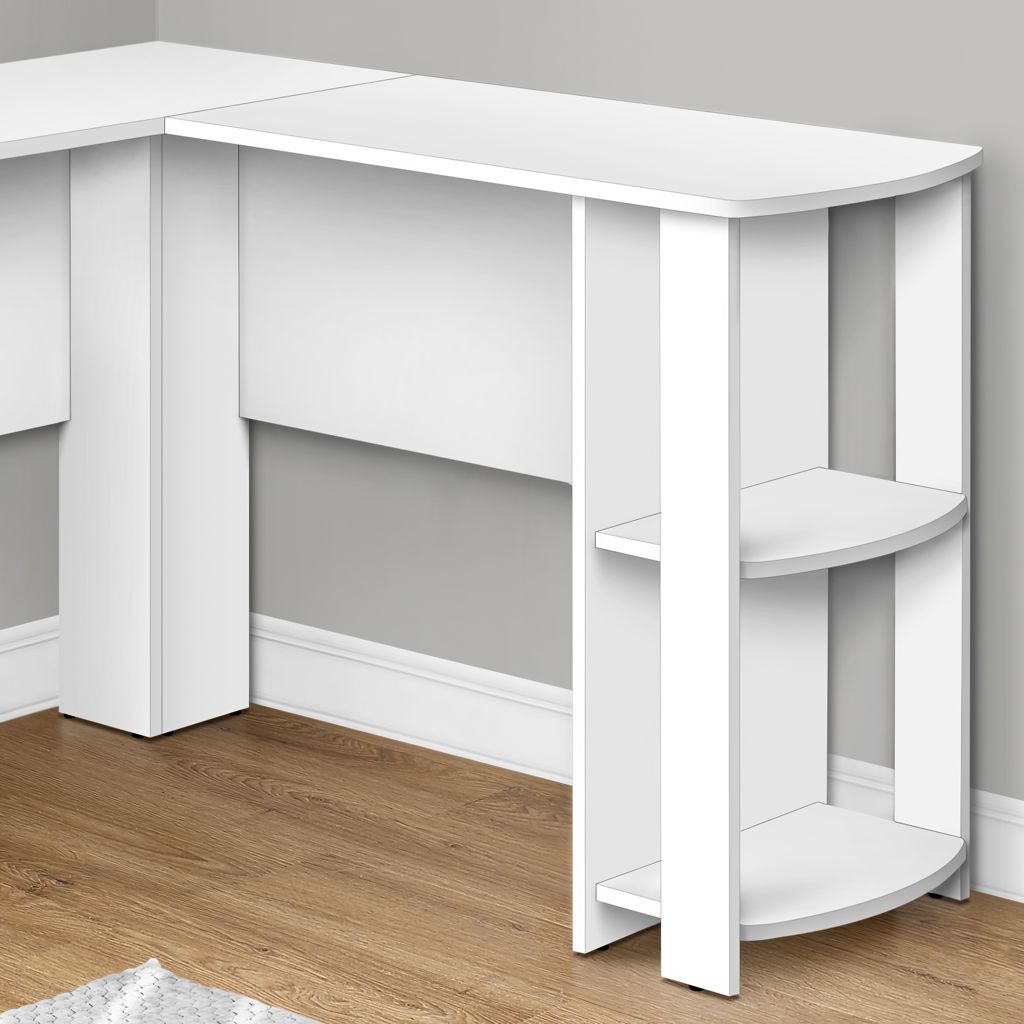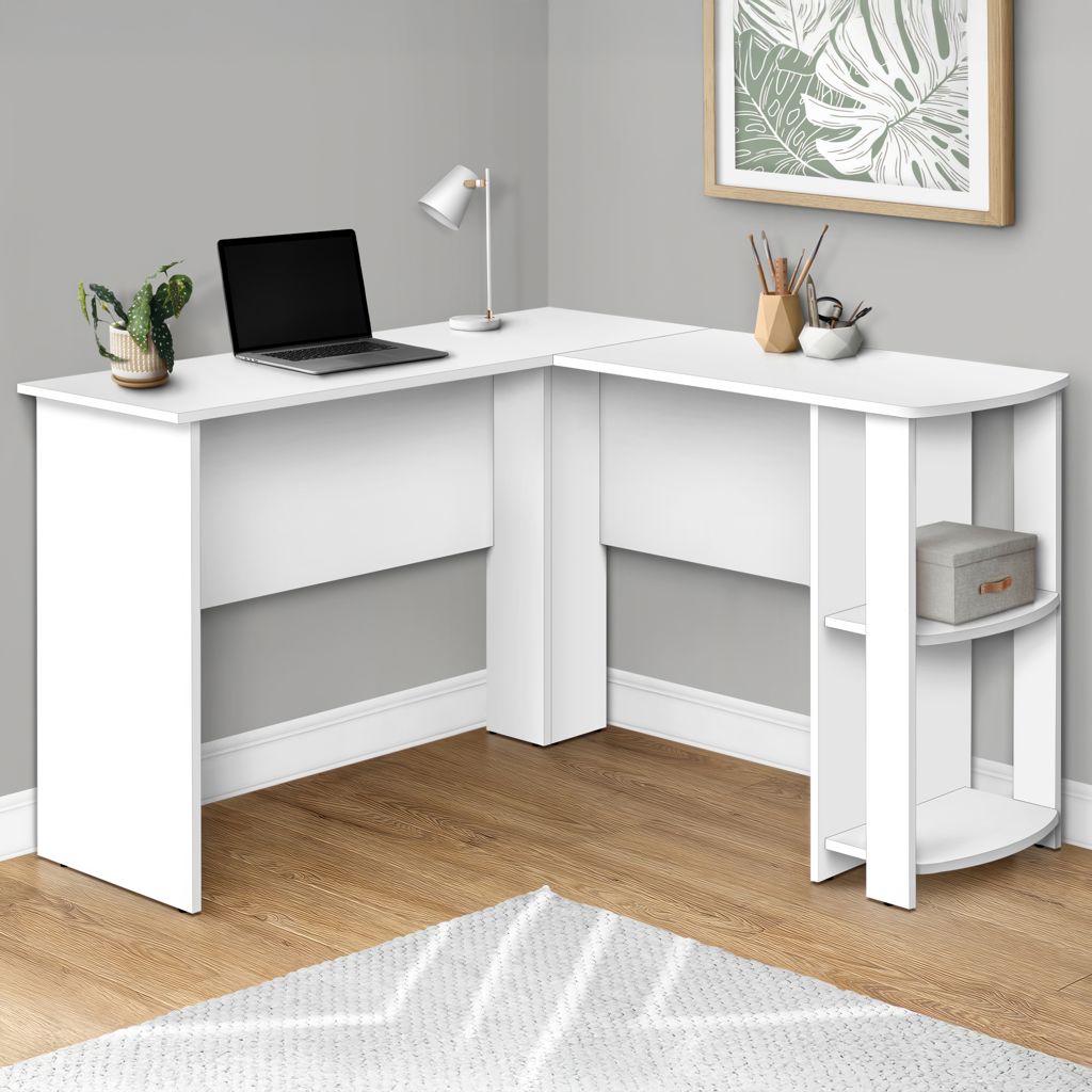 With a generous work surface and built-in storage, this L-shaped computer desk is ideal for students or home offices. The two convenient storage units keep books and school supplies neatly organized. Finished on all sides in white laminate, this versatile, space-saving desk is designed to be placed in a corner but can be positioned anywhere in a child's room, dorm room or home office.