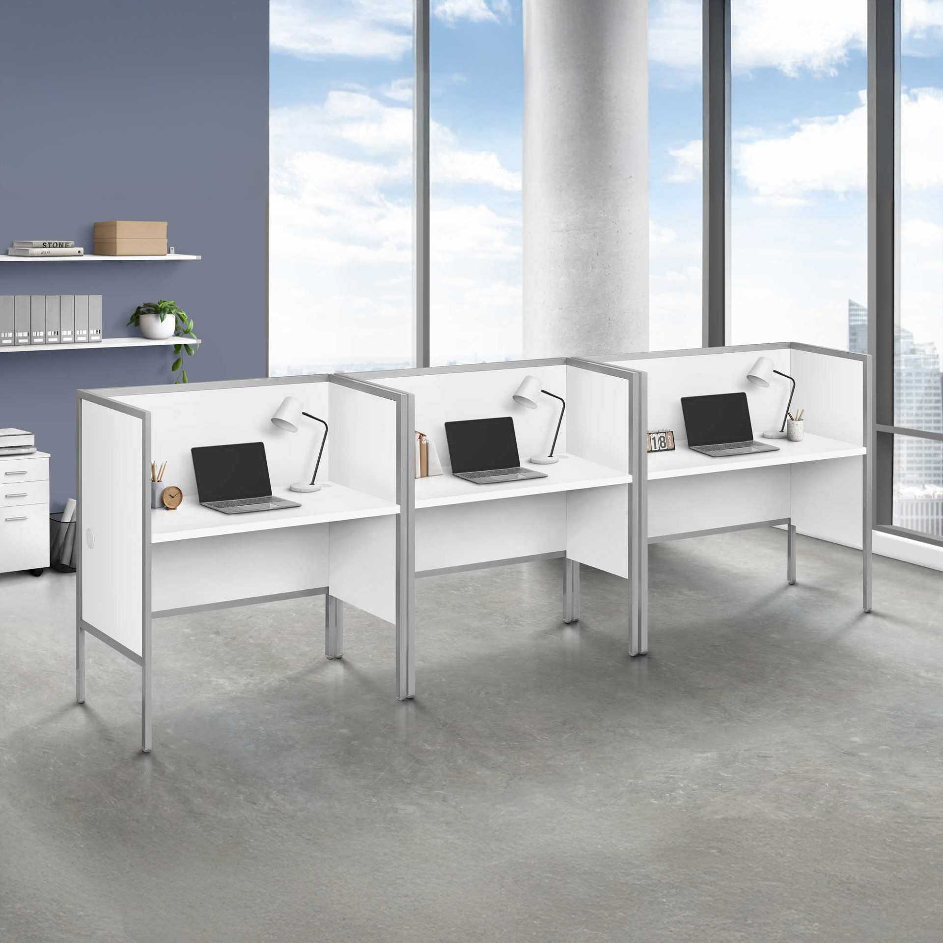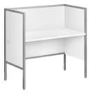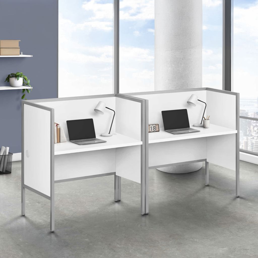 Create a functional workspace with this contemporary style 48"L office cubicle attached with a commercial grade desk, finished in a smooth white laminate and framed in sturdy silver metal with adjustable legs.