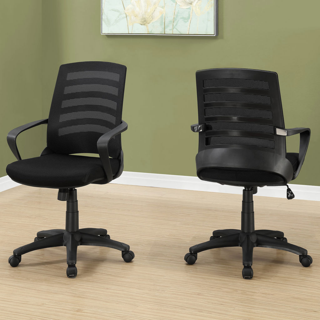 Update your workspace with this ergonomic and stylish office chair with medium-height backrest in black. BIFMA-certified, this comfortable and smart office chair has a solid curved backrest that will provide excellent posture control. The seat is generously padded and covered in a breathable fabric with a durable polyester mesh that matches its comfortable armrests. Its sturdy nylon base with five caster wheels delivers mobility on hard surfaces or carpets. Easy to assemble, this contemporary-style office chair is the perfect addition to your workspace!