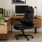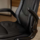 Upholstered in a soft black imitation leather fabric, perforated at the seat and back to provide better ventilation. This 360-degree swivel chair features a thick padded seat and curved back with lumbar support for long hours of comfort.