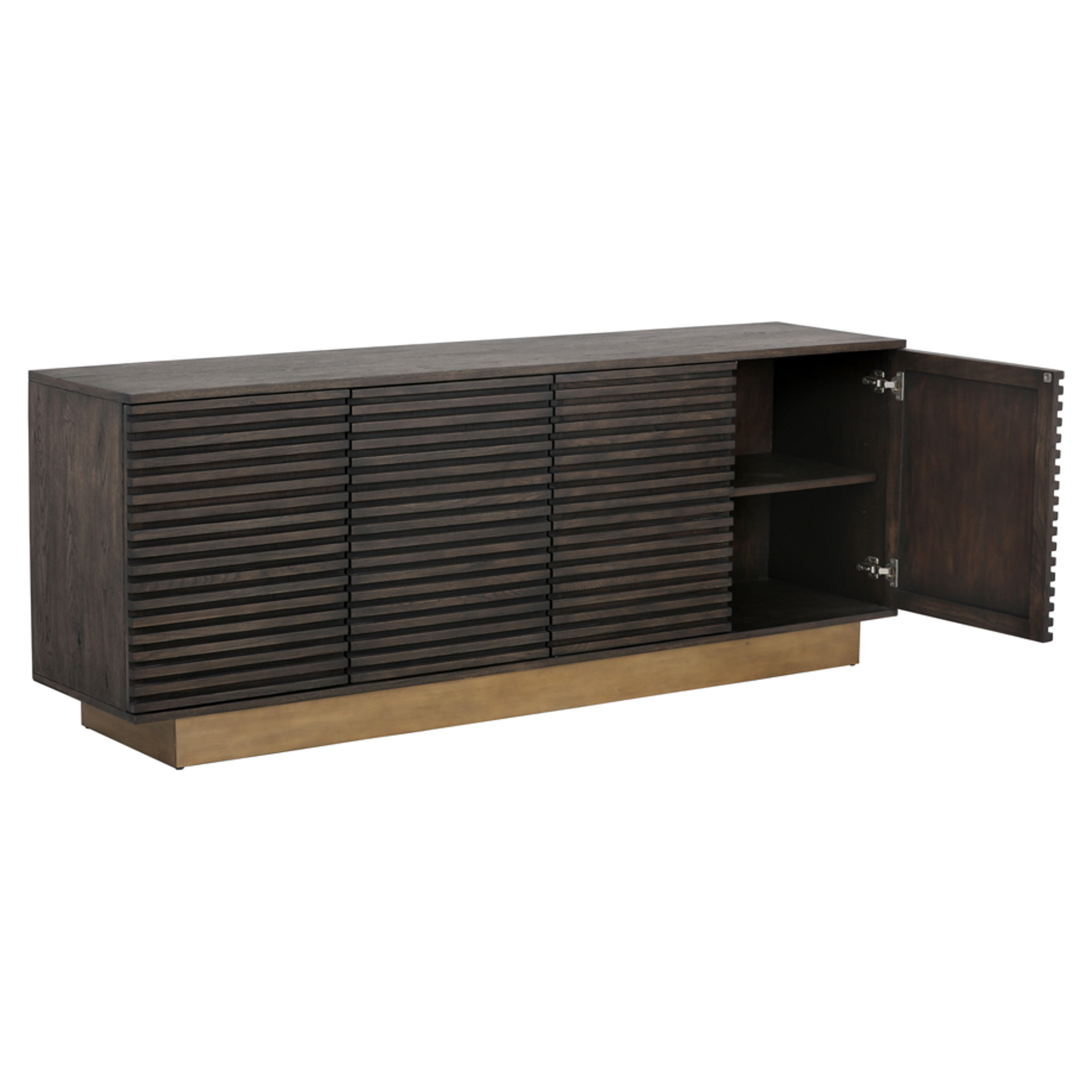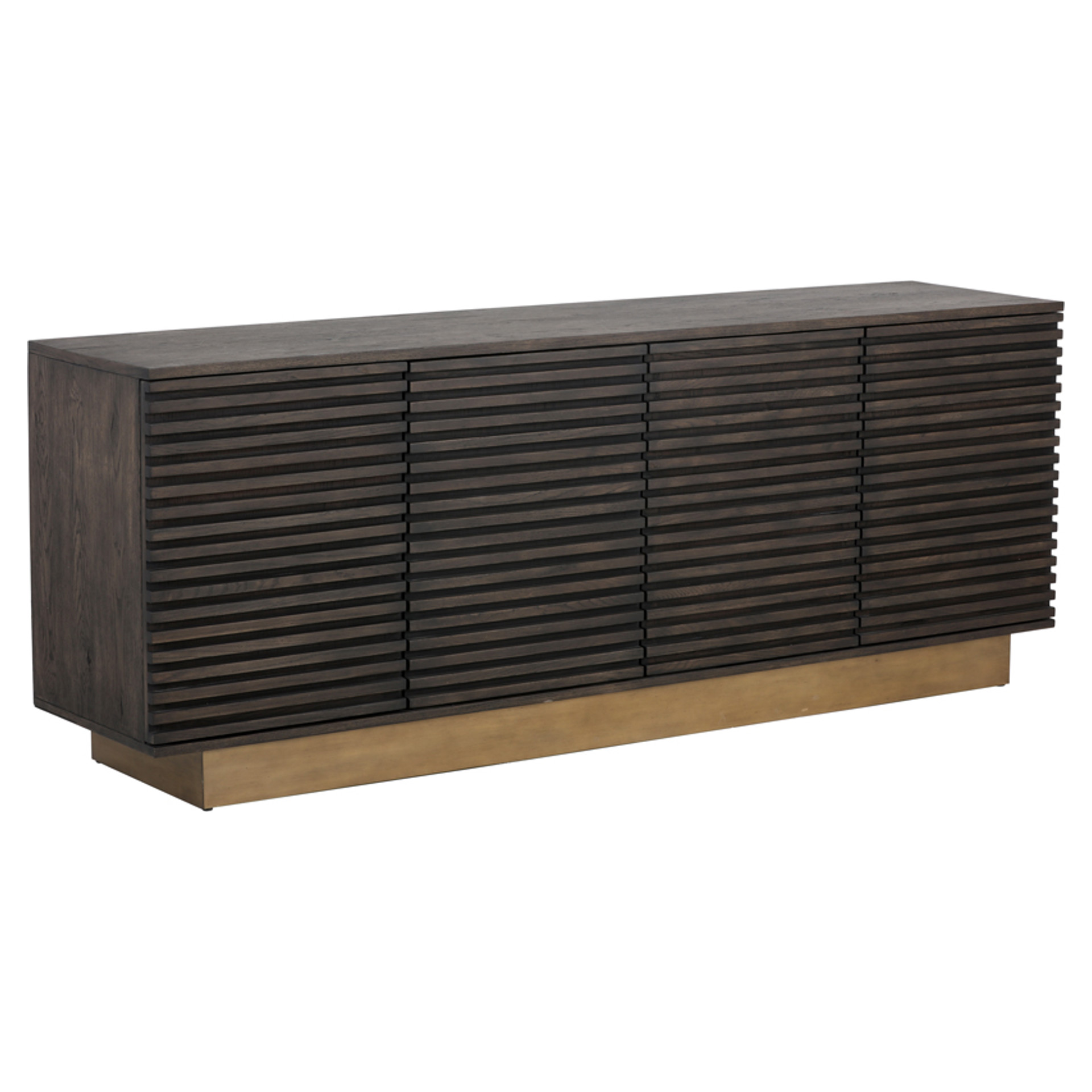 This beautifully crafted sideboard from our MIXT collection will add allure to any dining space. Designed with four large panelled cabinet doors and shelving for ample storage. An antique brass steel base completes the look. Distressed finish will have visible cracks and dents are part of the finish.