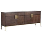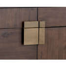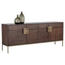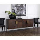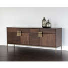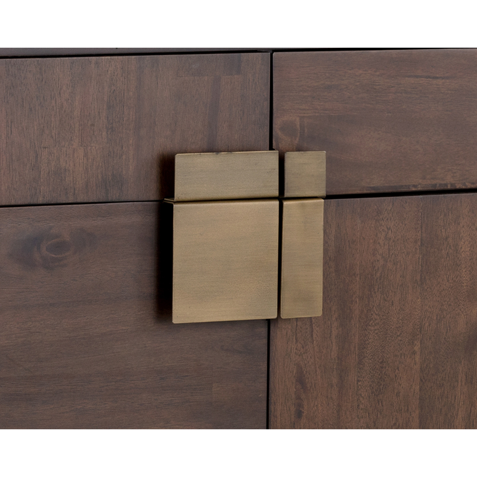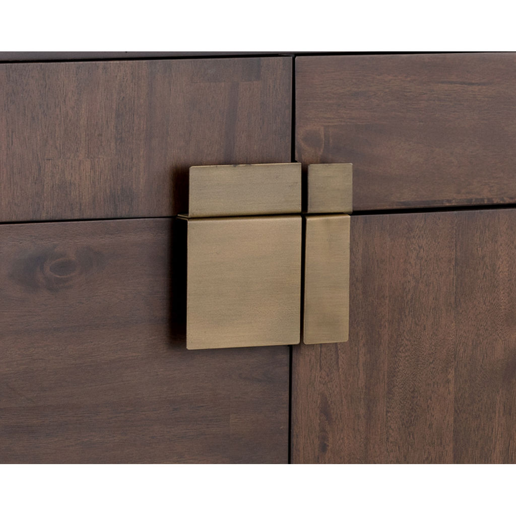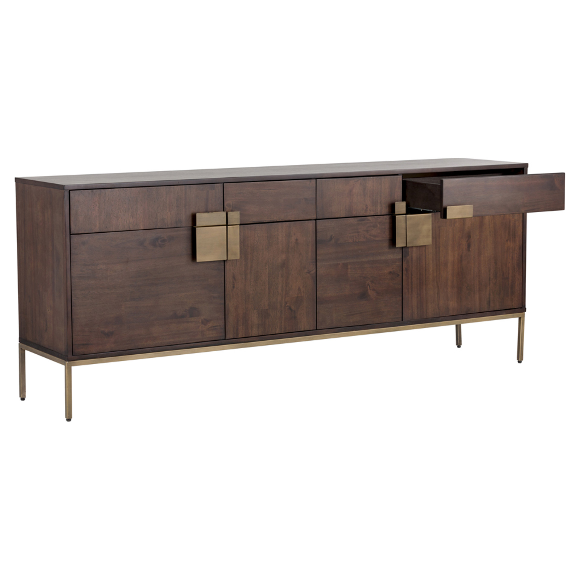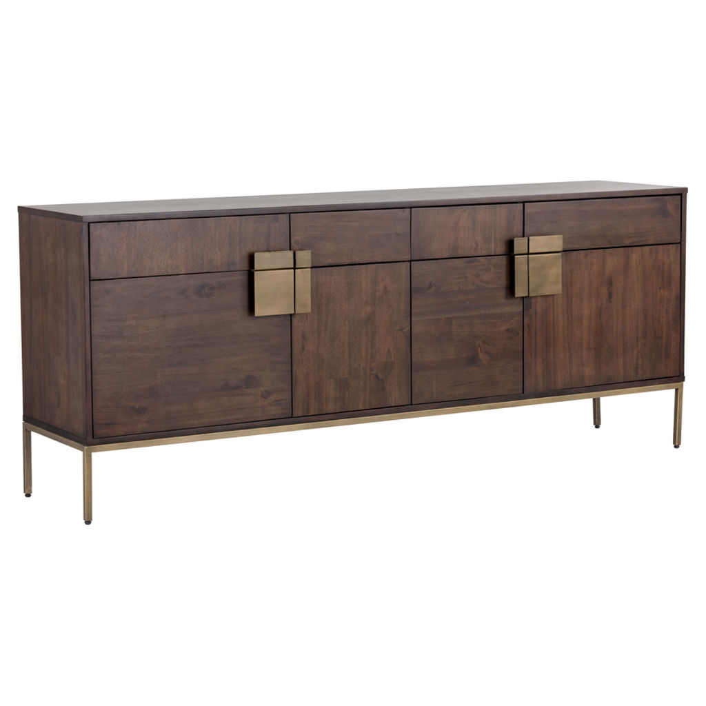 This uniquely crafted sideboard will add transitional allure to any dining space or foyer. Made from acacia wood veneer with four drawers and two large cabinets for ample storage. Alternating wood grain patterns on the drawer fronts and antique brass hardware complete the look. Suitable for residential and contract settings.