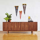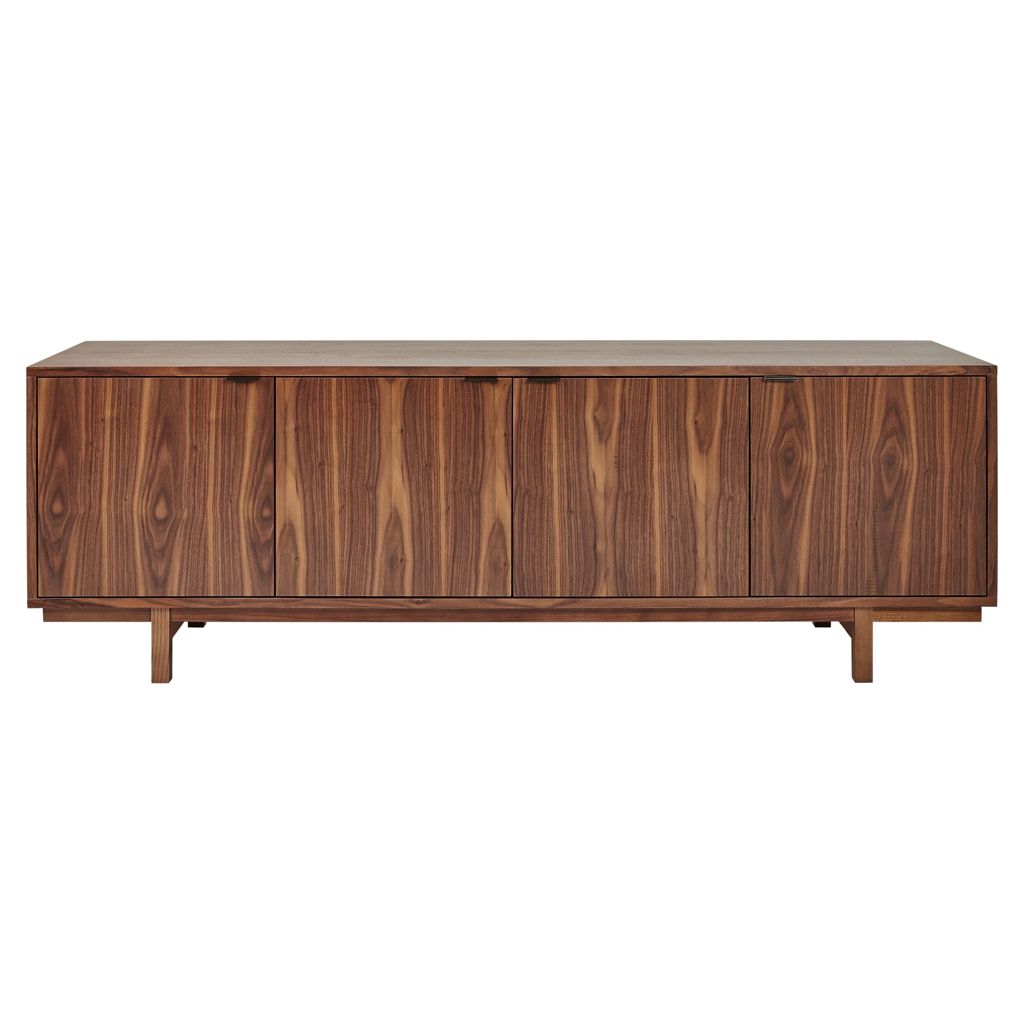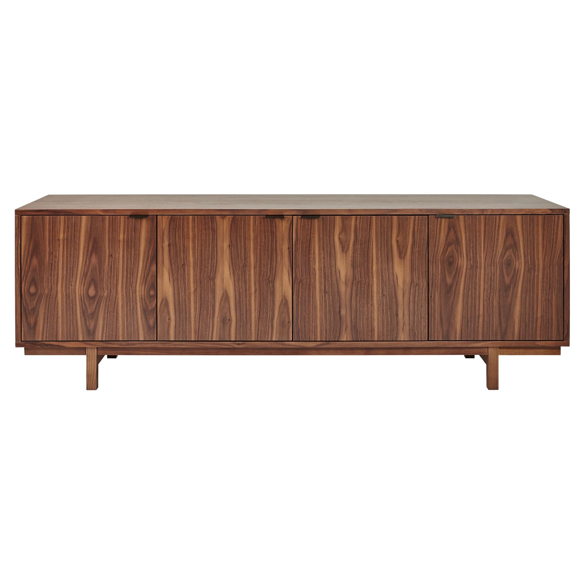 The Belmont credenza is an architecturally inspired storage design that highlights the natural beauty of walnut. The doors conceal adjustable shelves and feature contrasting handles in a black finish.