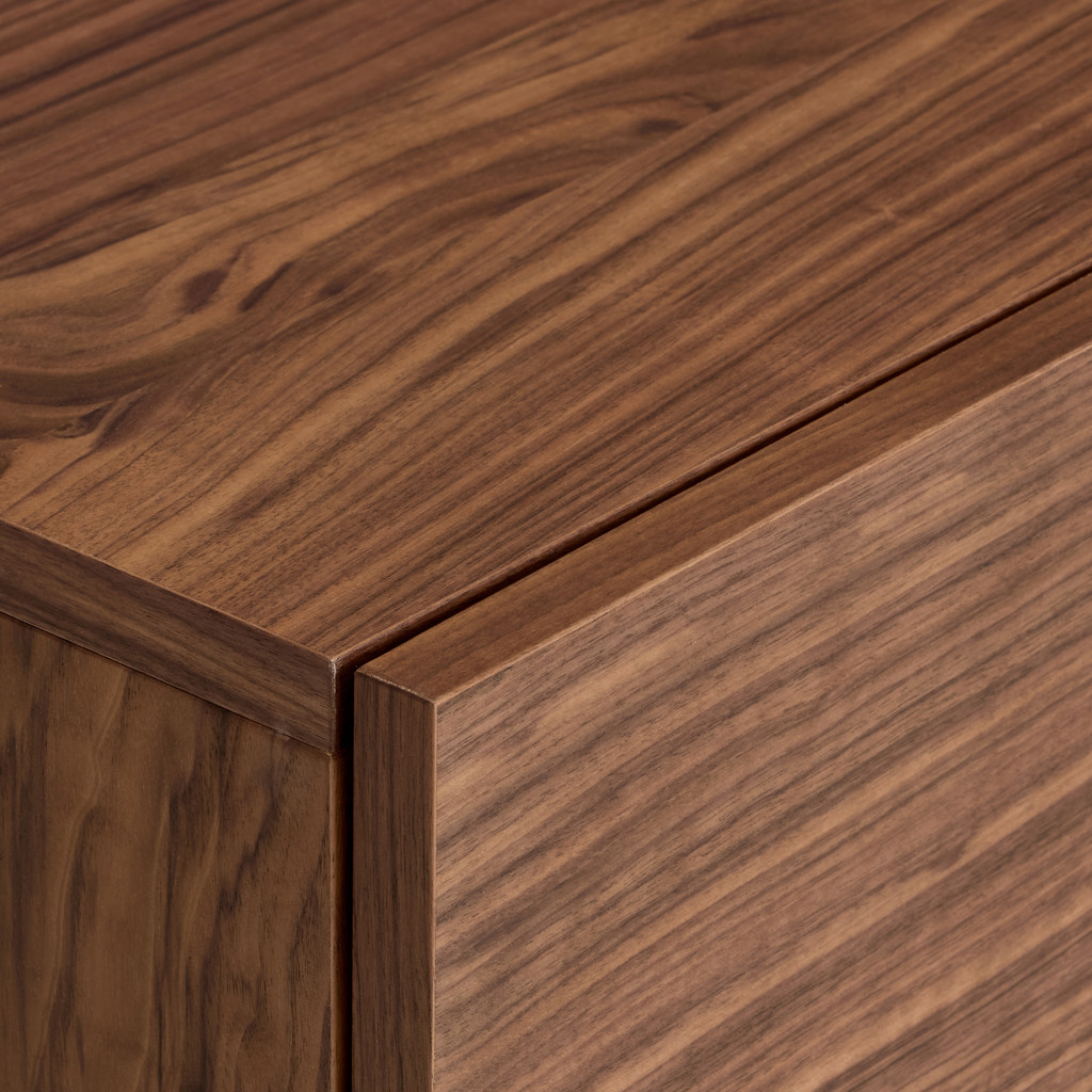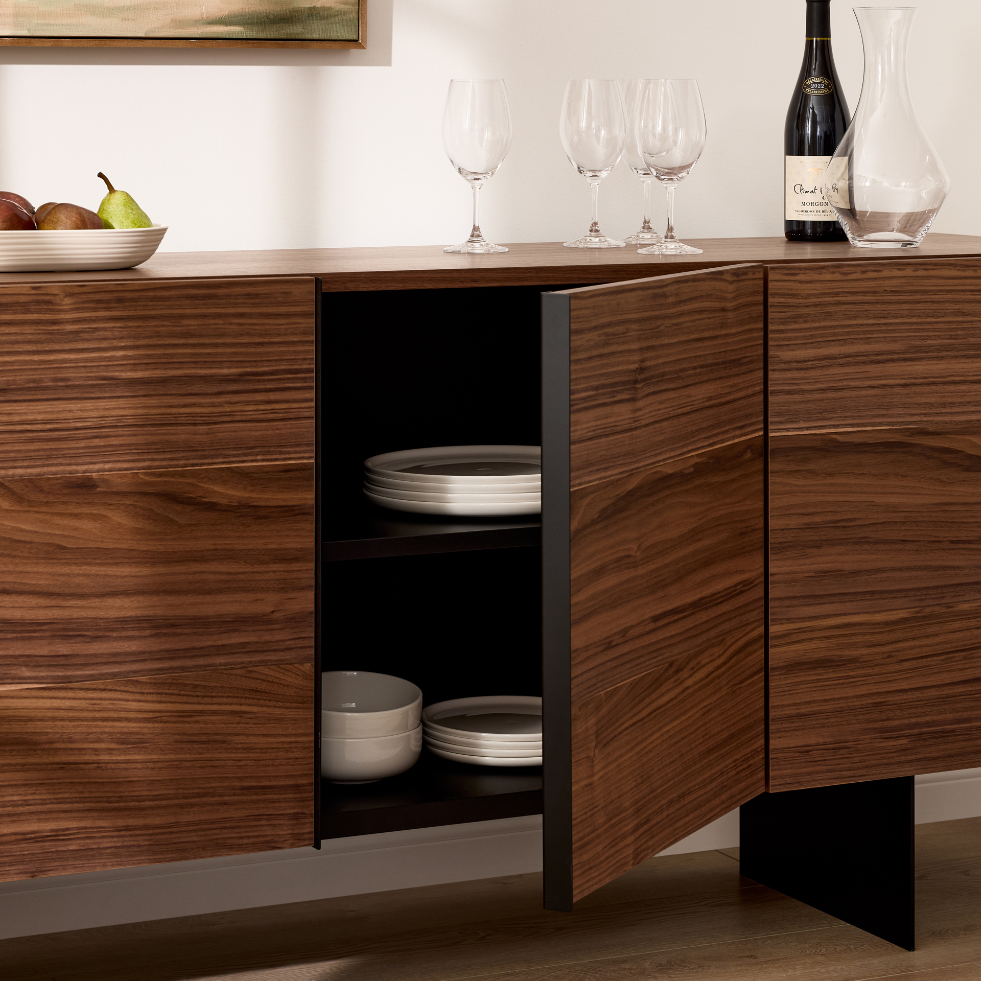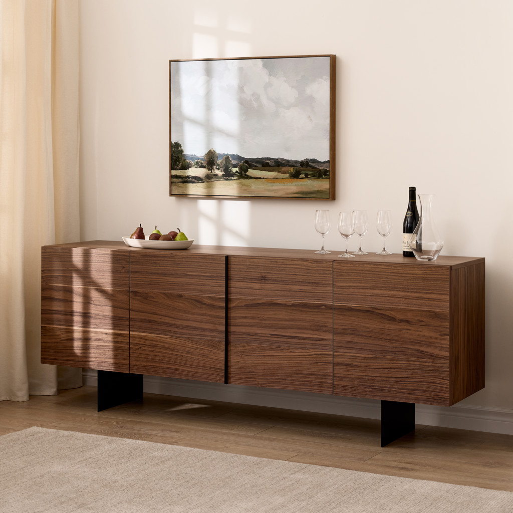 This walnut veneer sideboard will instantly transform your living space. Its warm finish highlights the natural beauty of the wood grain, creating a welcoming and refined atmosphere. With its four spacious compartments, it offers generous storage while maintaining clean, contemporary lines.