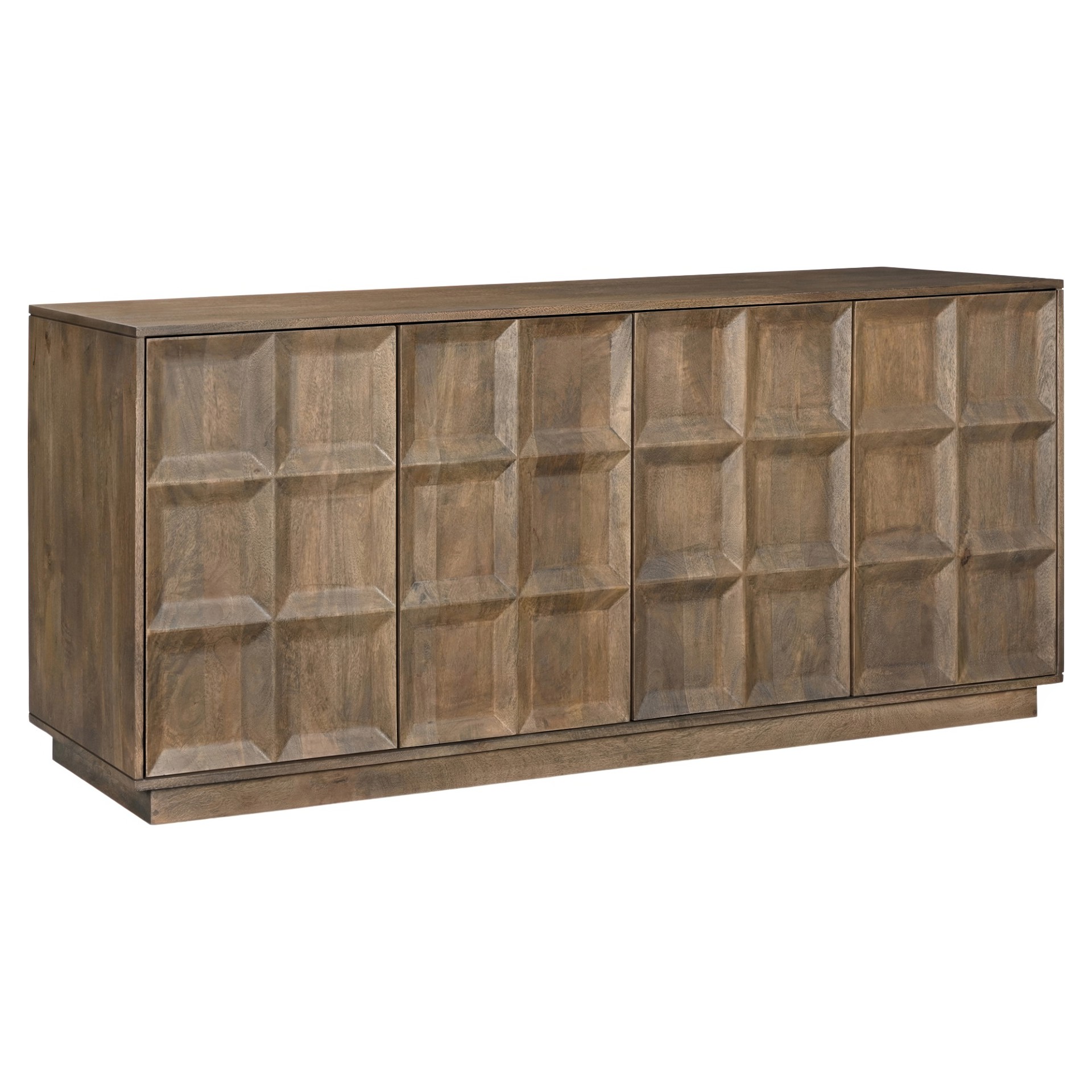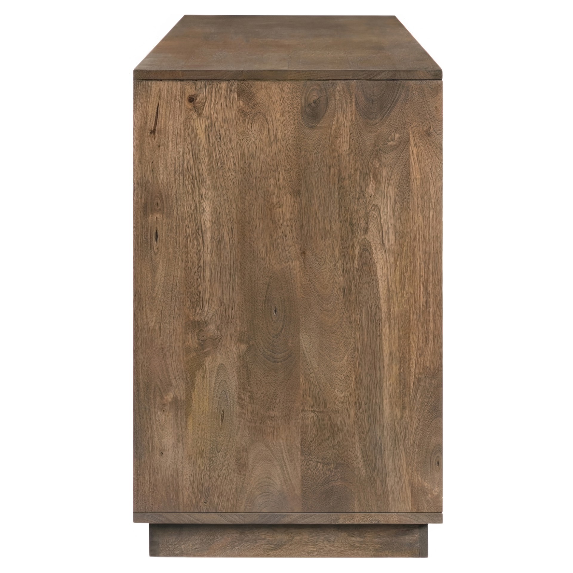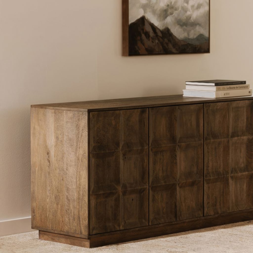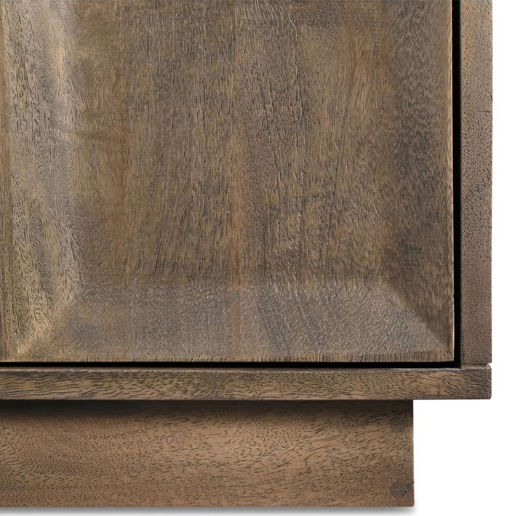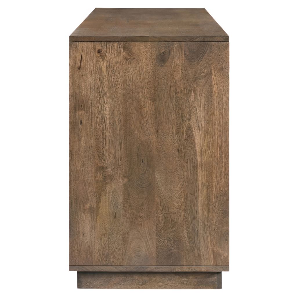 Crafted from solid Mango wood with a matte sandblast brown finish, this piece features a simple, blocky silhouette that adds dimension.