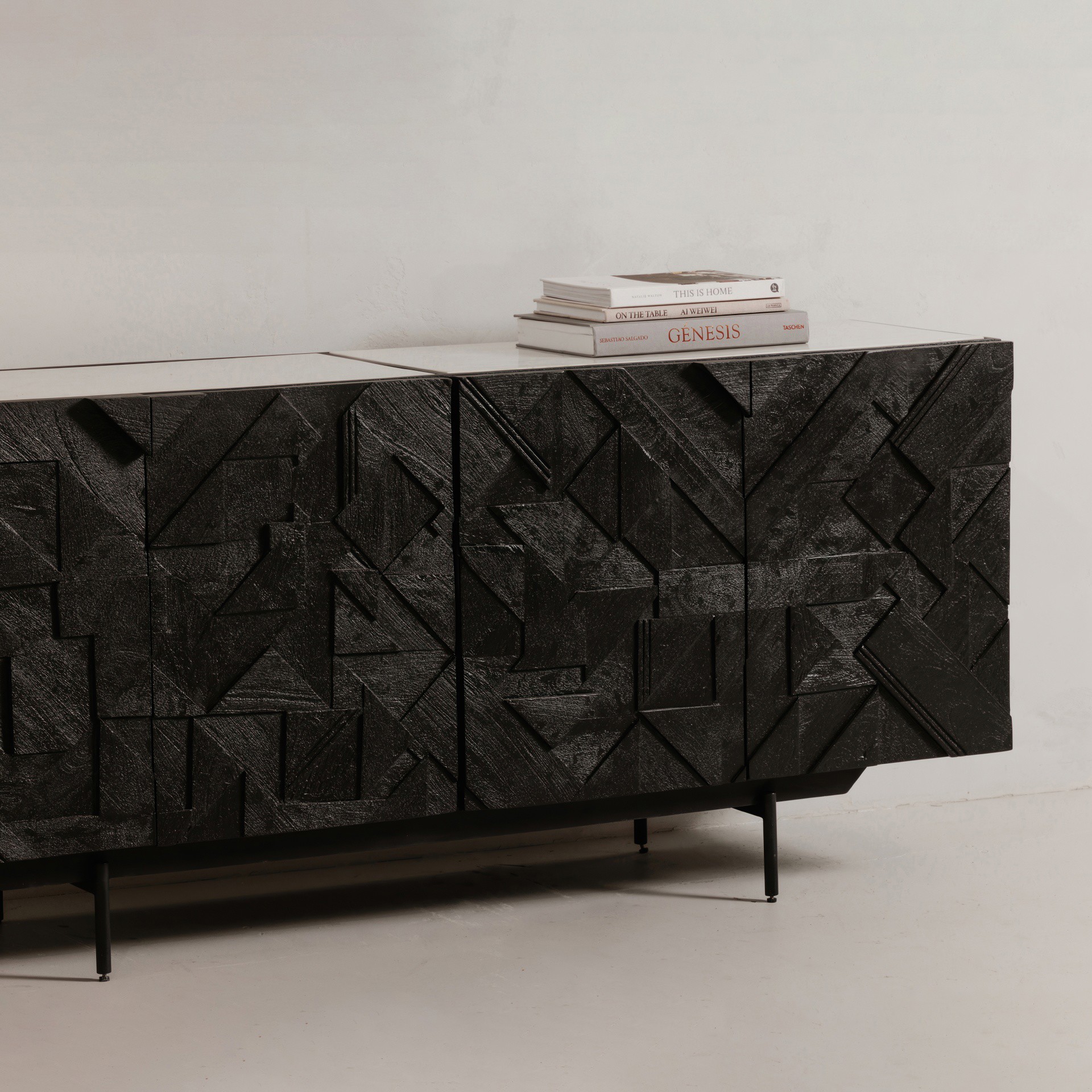 Fitted with barn doors, this sideboard buffet is large and spacious. The Kattan Sideboard is made with sustainable mango wood, which is both strong and durable. The white marble top finishes off the look, making it a head turner for any contemporary modern décor.