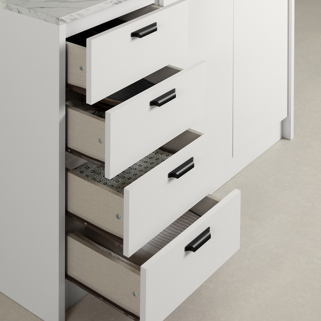 Every time you're finally motivated to cook a good meal, you remember how impractical your kitchen is and the urge disappears right away? This kitchen island with built-in storage will instantly make you want to get out your pots and pans and start cooking! Whether you live in a house, a condo or an apartment, this worktop that has 4 drawers on metal runners, 2 doors behind which hides a removable shelf and a melamine surface will fit perfectly in your kitchen area.