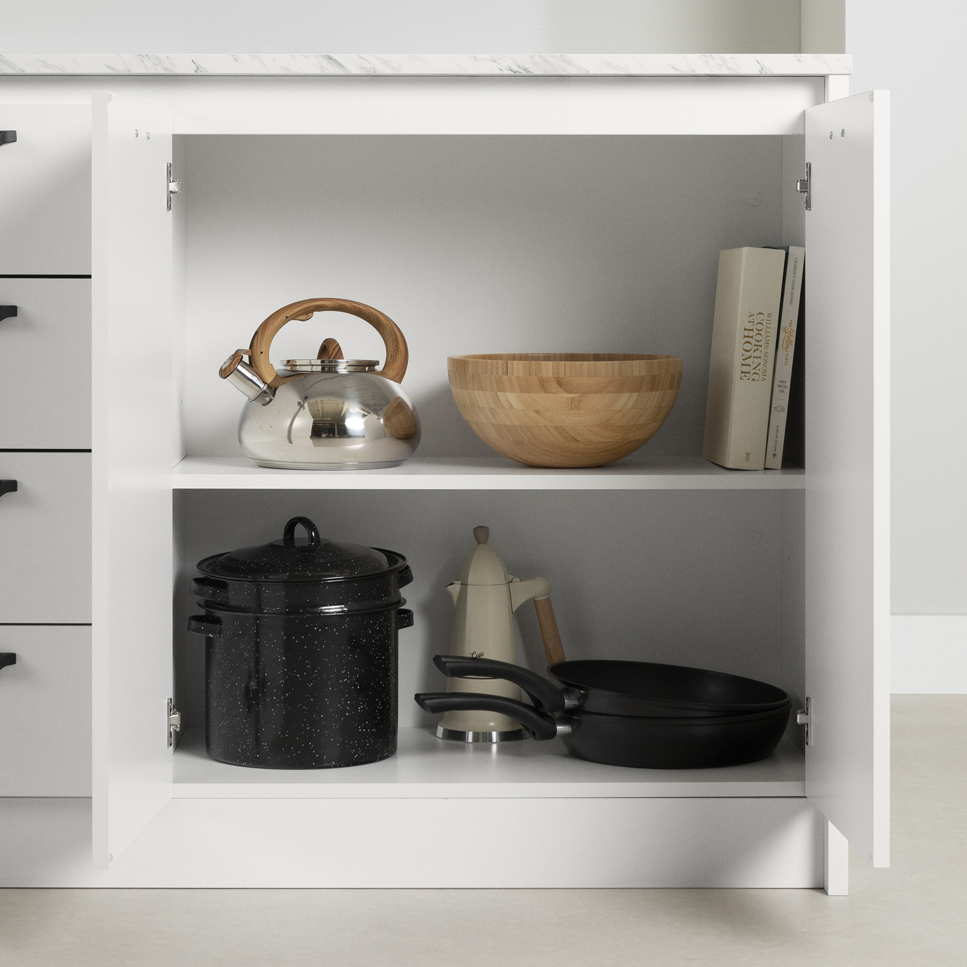 SMART BUILT: Don't know where to store your slow cooker, blender, and other small appliances? Take advantage of the 4 heights offered by the adjustable shelf located behind the 2 doors to organize all your appliances. The shelf can support a maximum weight of 25 lb.