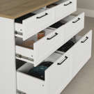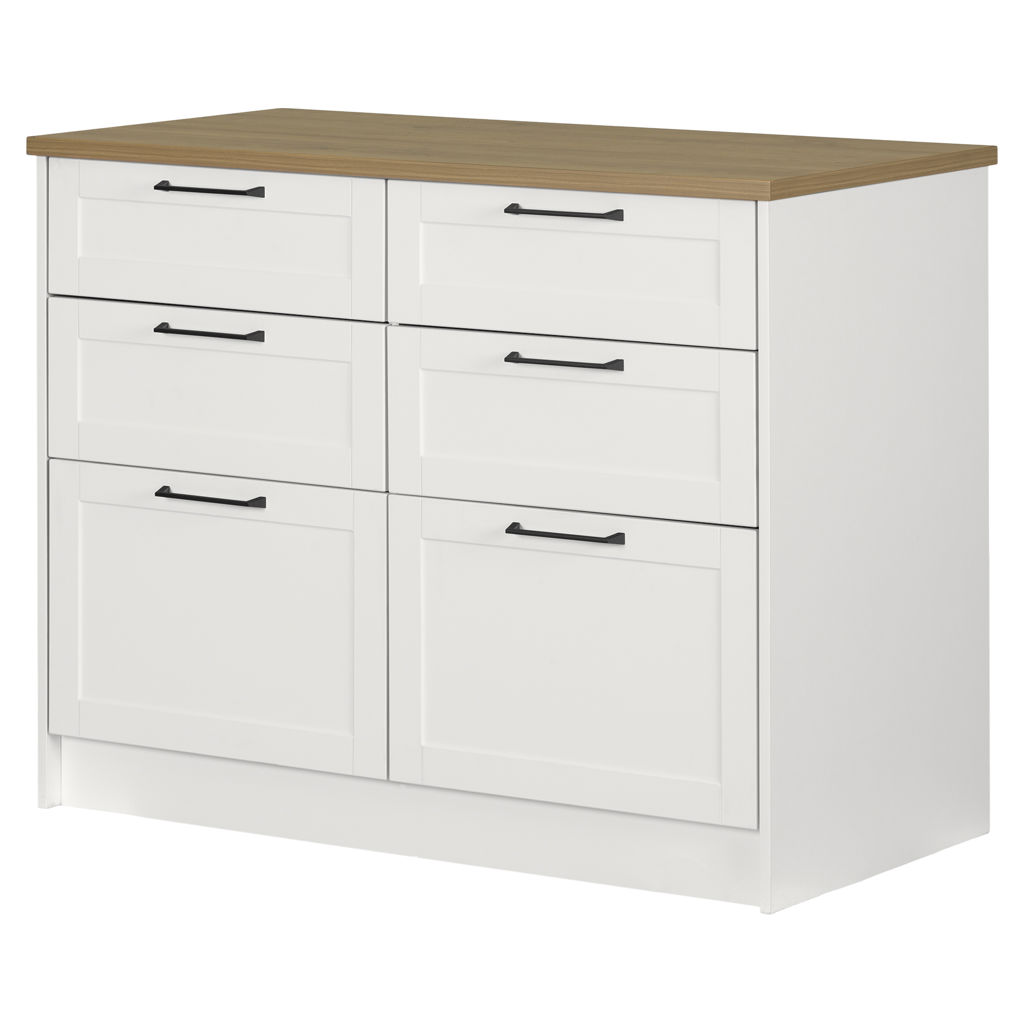 This island is designed to be the perfect ally in your kitchen, blending utility and elegance effortlessly. It comes with six strategically sized drawers: the top ones for utensils, the middle ones for various containers, and the larger bottom drawers for pots and pans.