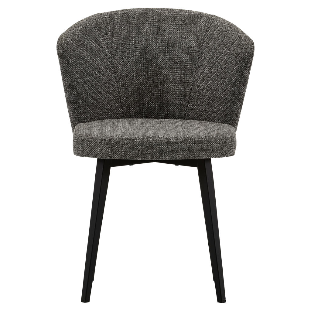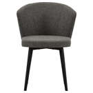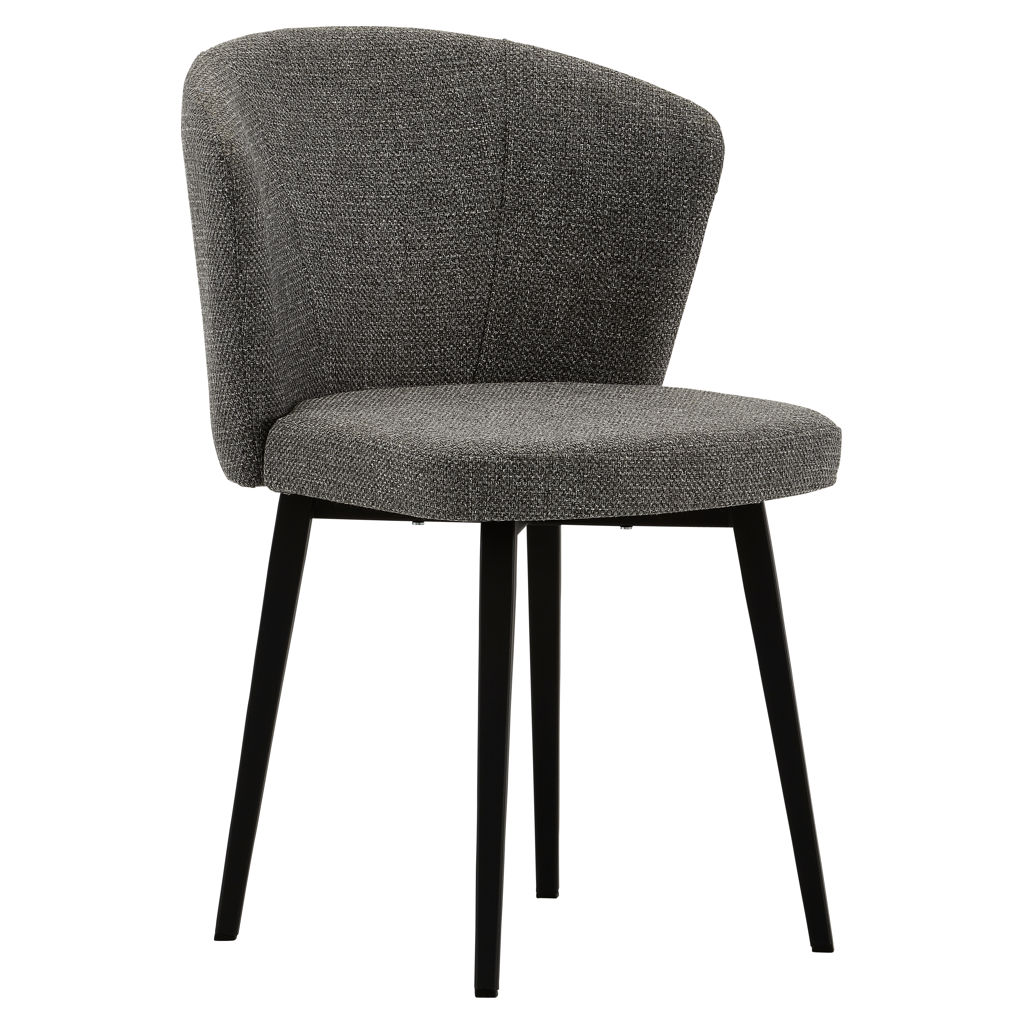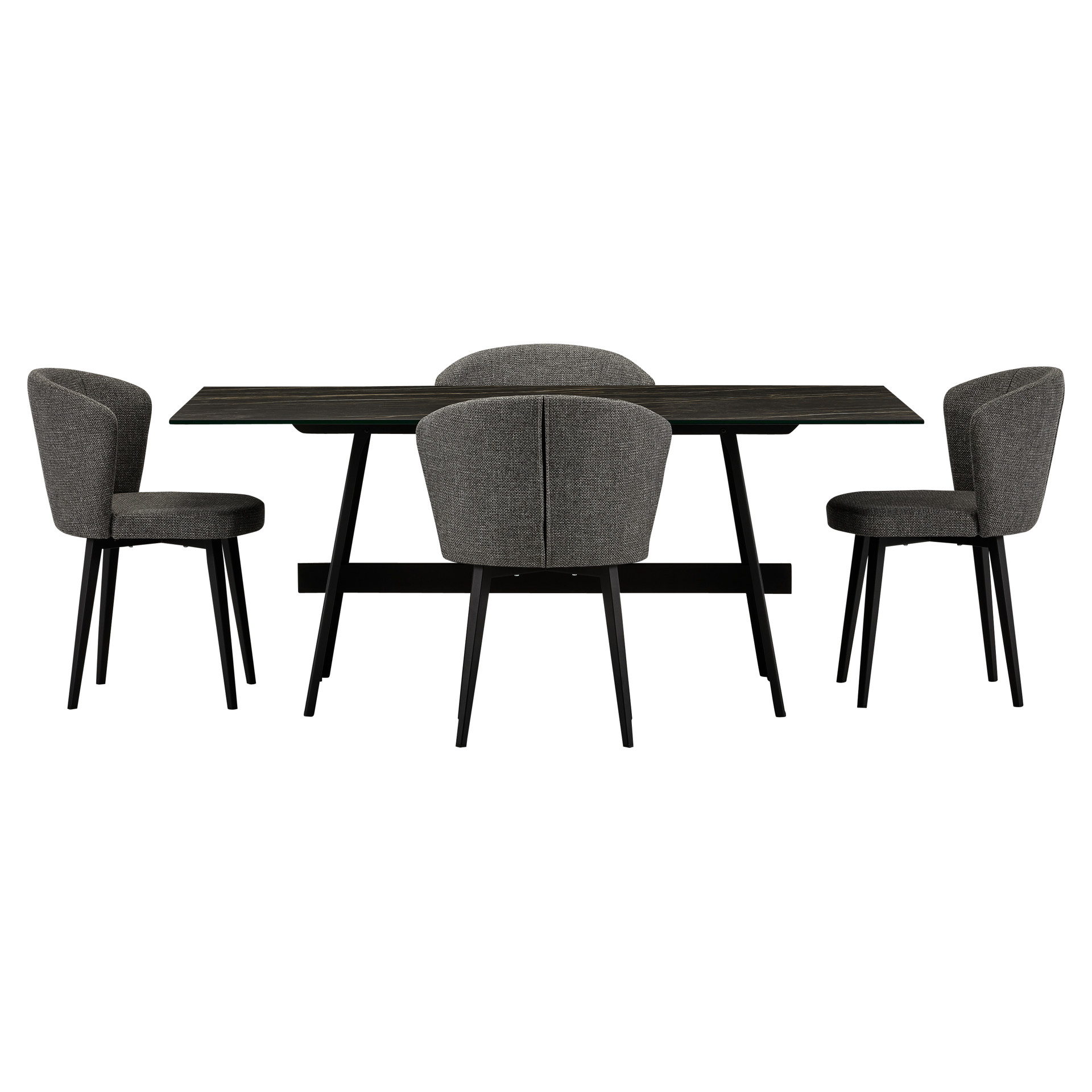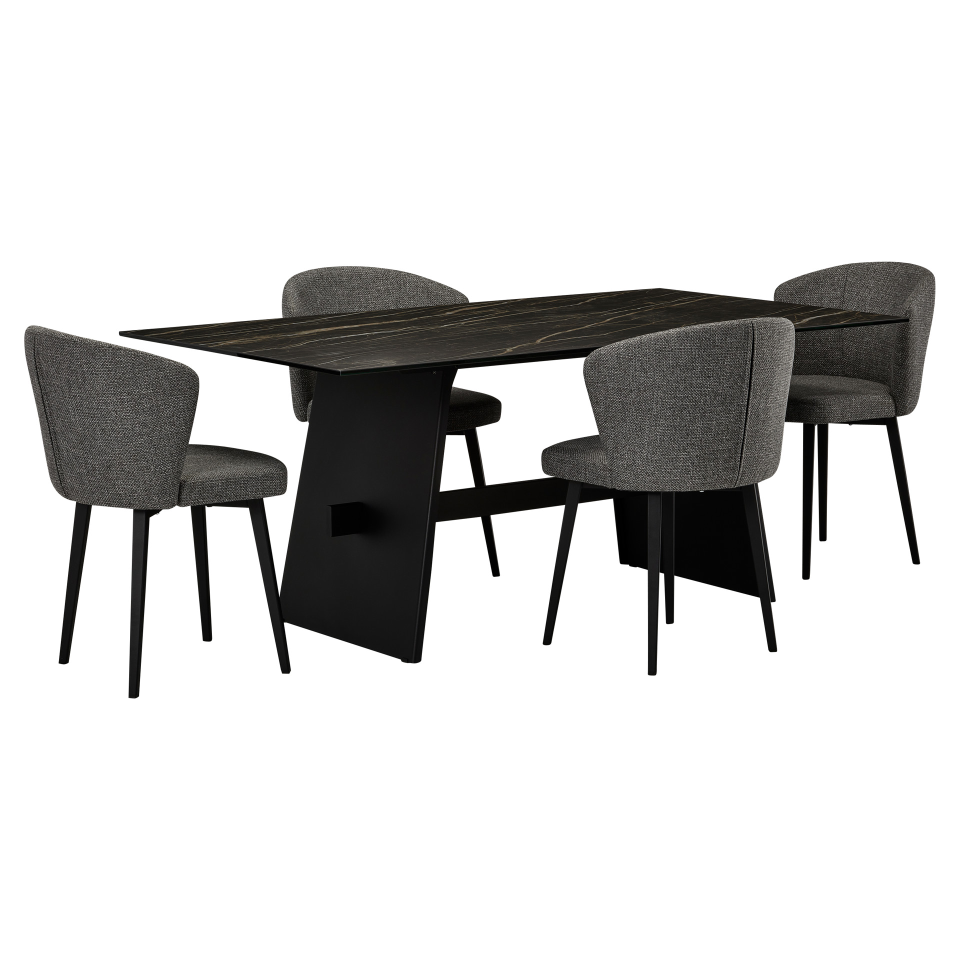 The striking table, featuring a porcelain top with deep natural veining, pairs beautifully with its architectural black base. The wraparound chairs, upholstered in textured charcoal-gray fabric, offer exceptional comfort with their generous backrests and cushioned seats.