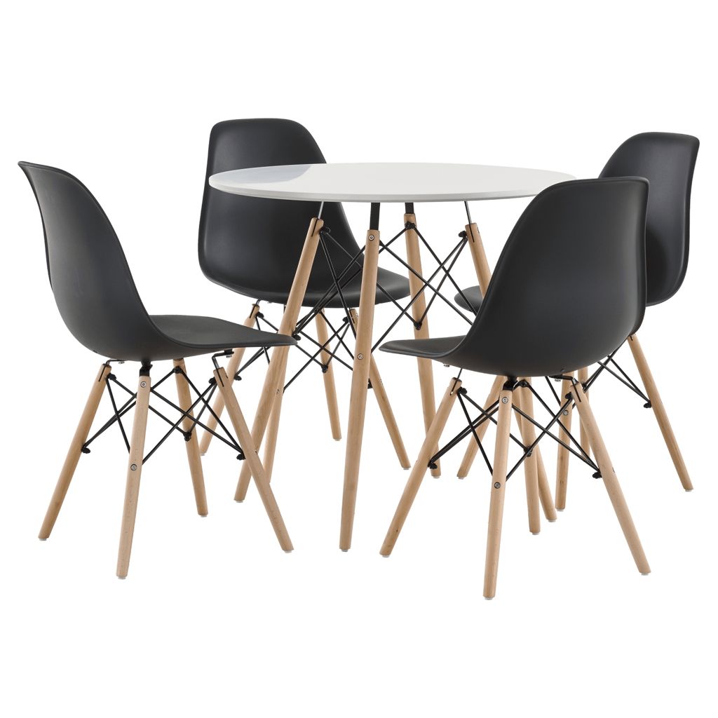 Transform your dining area with this perfectly balanced set. The round table with its pristine white top creates a welcoming atmosphere, ideal for gathering family and friends. Its four ergonomically designed chairs provide optimal comfort with their sculpted seats and sturdy structure.