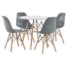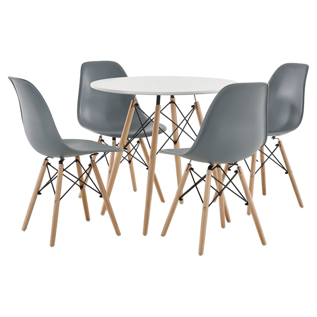 Transform your dining area with this perfectly coordinated set. The round table with its pristine white top creates a warm, inviting atmosphere, ideal for bringing family and friends together. Its four ergonomically designed chairs provide optimal comfort with their sculpted seats and sturdy construction.