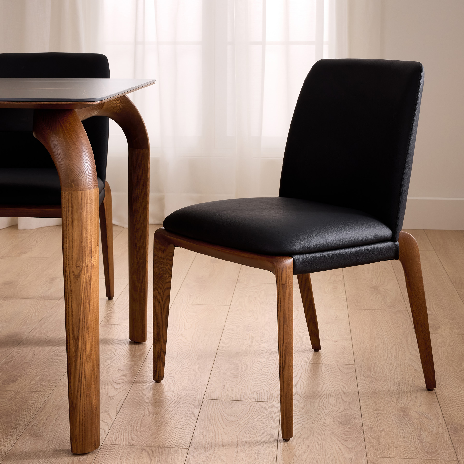 Natural wooden legs bring authentic warmth, beautifully contrasting with the deep black of the tabletop and seats. This set creates a refined atmosphere, perfect for family meals or evenings with friends.