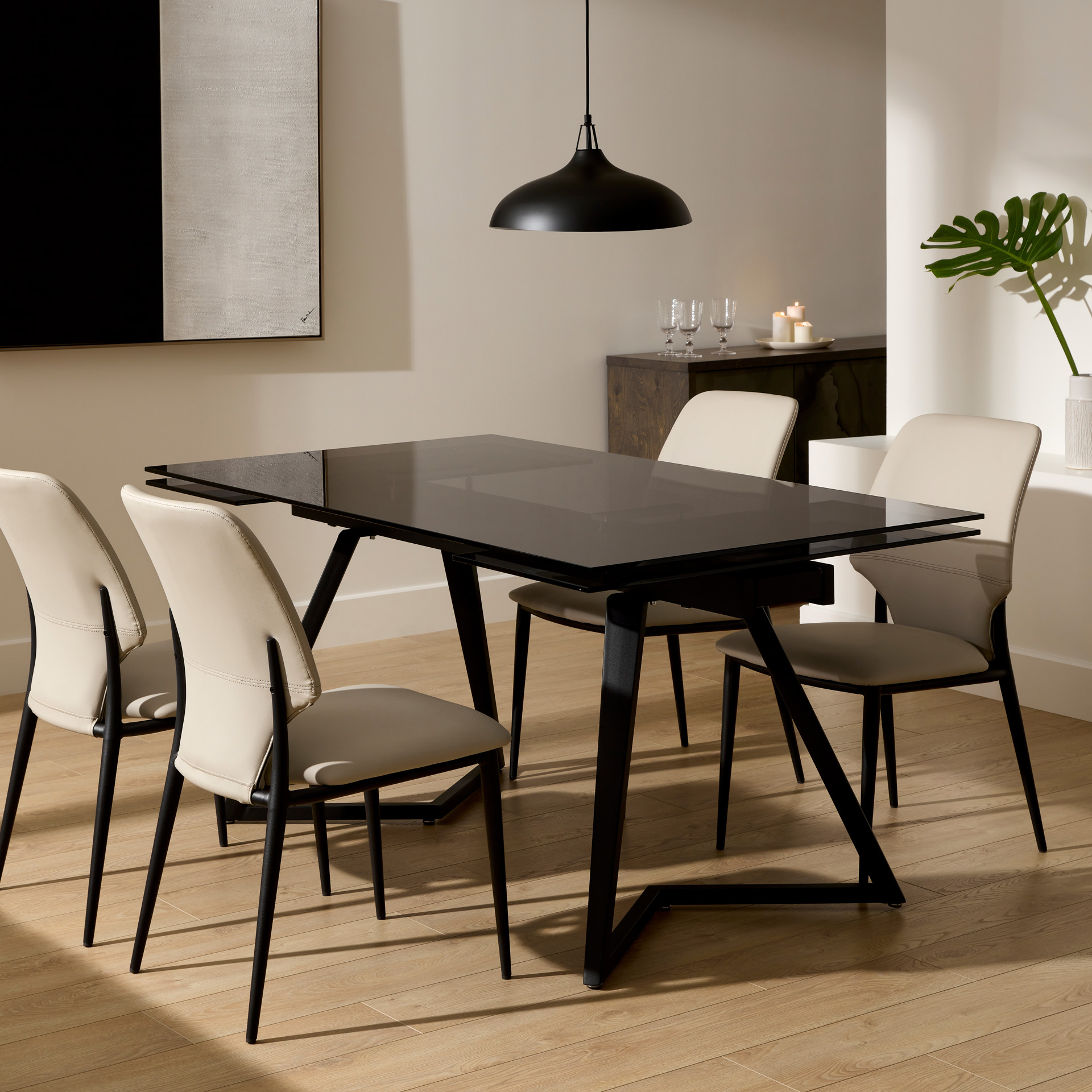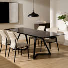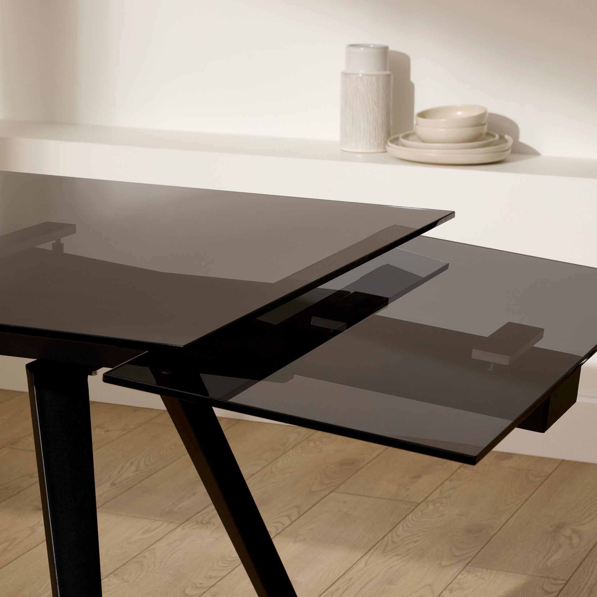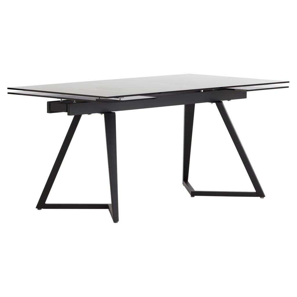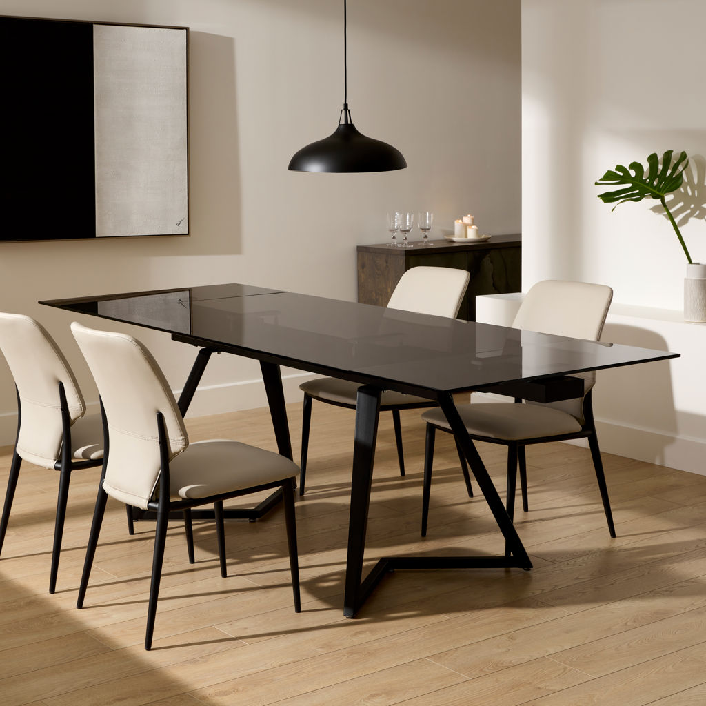 Discover this sleek dining table paired with contemporary chairs for a perfect balance of style and functionality. The tinted glass table rests on a sturdy black base and offers a spacious surface ideal for hosting your guests. Its extendable top allows you to adjust the space to suit any occasion.