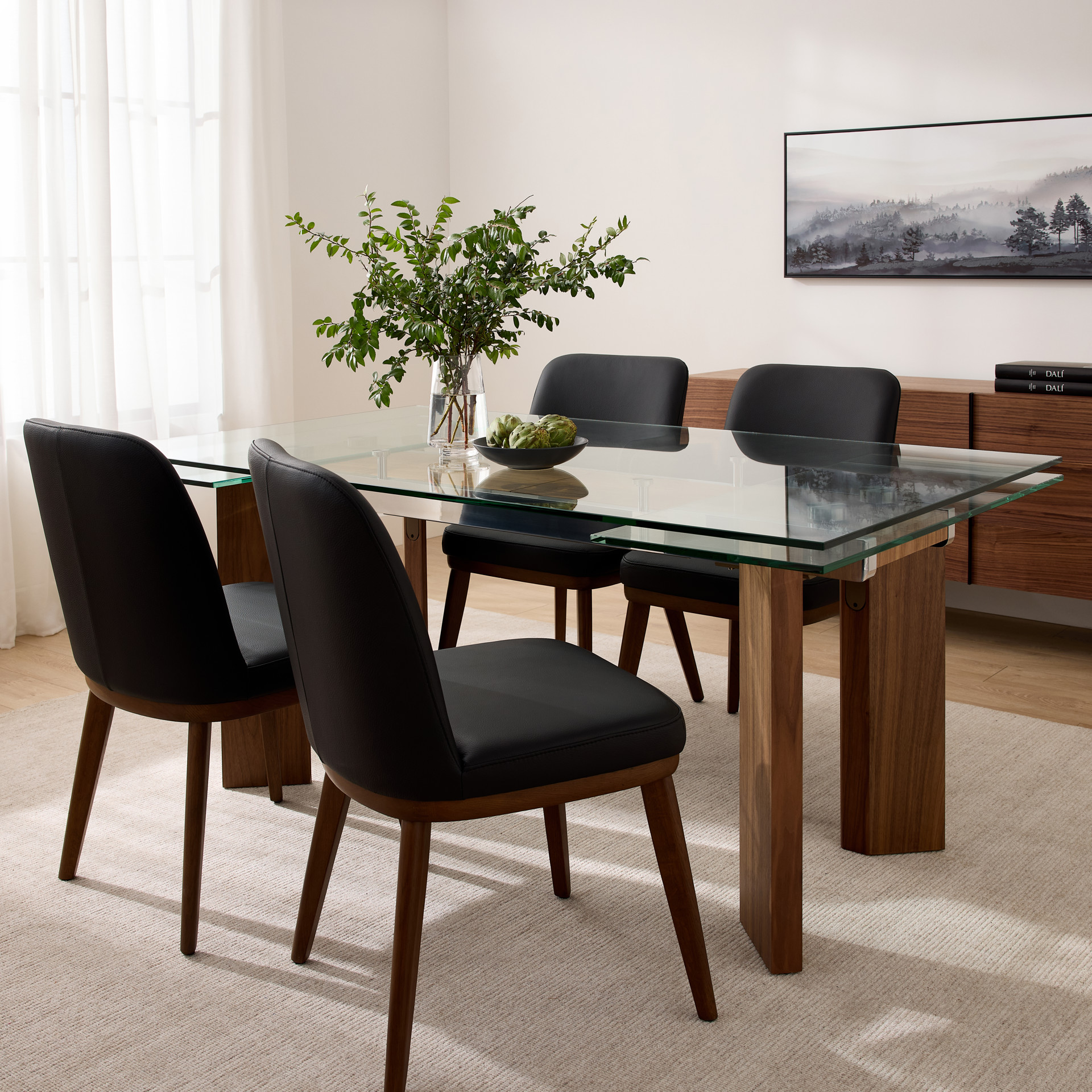 Transform your space with this elegant set that blends modern design with timeless appeal. The sleek glass table rests on solid wood legs, creating a harmonious contrast that draws the eye. The genuine leather chairs provide exceptional comfort and outstanding durability, while their clean lines complement any interior style.