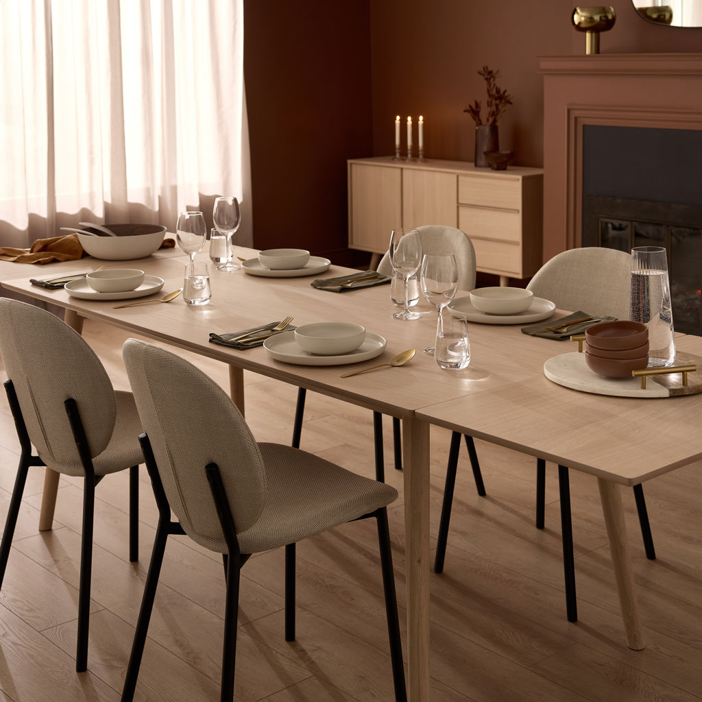 This oak wood collection perfectly unites the Trondheim table and Cliff chairs in a cohesive style that will elevate your dining room. Each piece has been carefully selected to create a warm and elegant atmosphere where every meal becomes a special moment.
