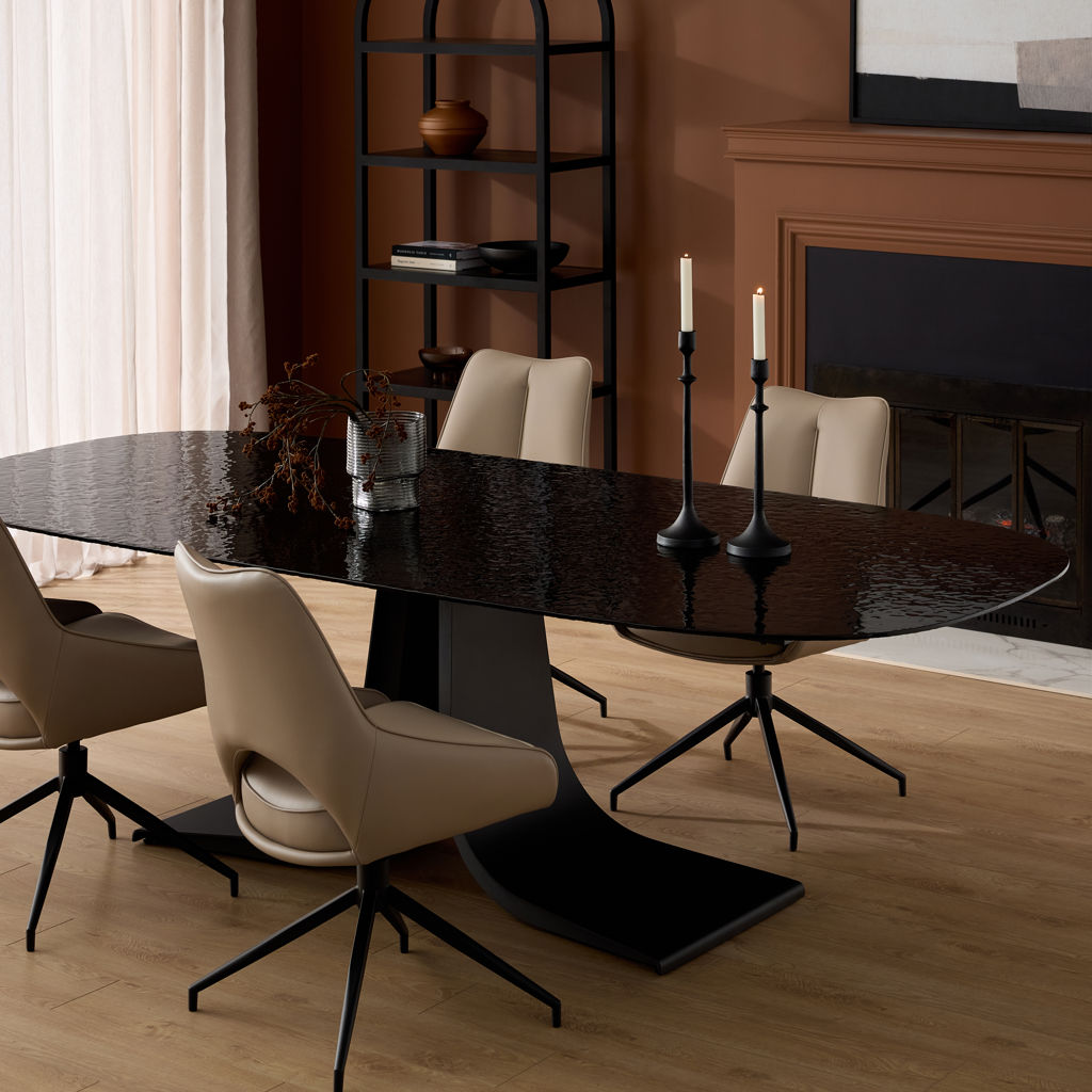 Its textured glass tabletop catches the eye, turning every meal into a visual experience.