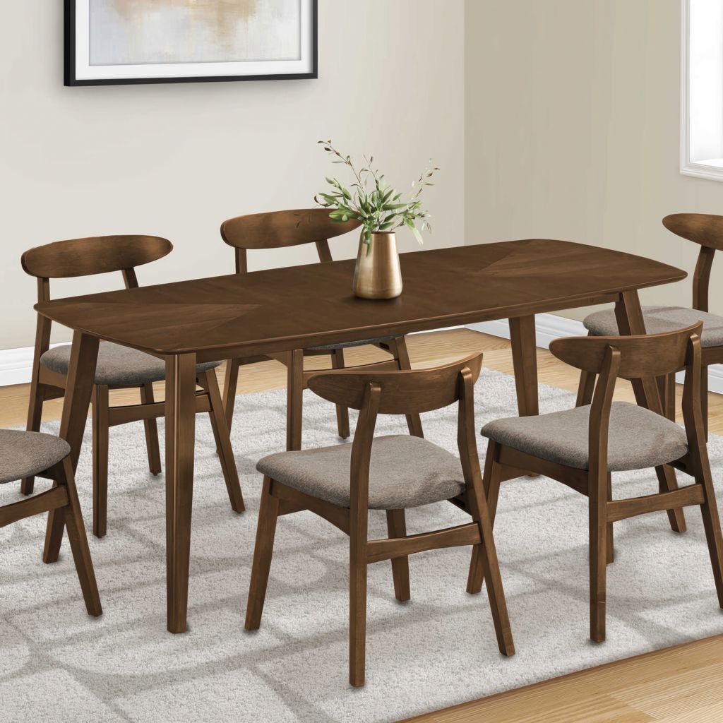 Crafted with a dark walnut veneer top and solid wood angled legs, this durably designed piece is perfect for casual family dining, easily seating up to 6. The easy to clean top ensures that mealtime messes are a breeze to wipe away.
