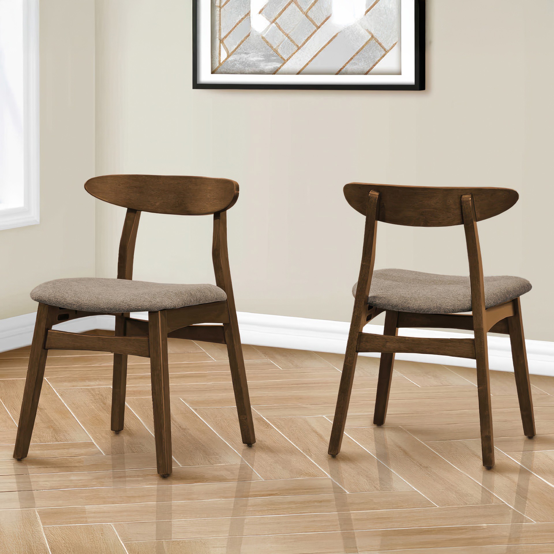 Crafted with sturdy construction, these dining chairs feature angled solid wood legs in a rich dark walnut finish that add a touch of elegance to your kitchen or dining room. The ergonomic friendly, curved solid back design offers ample support while enjoying a meal or engaging in lively conversation around the table.