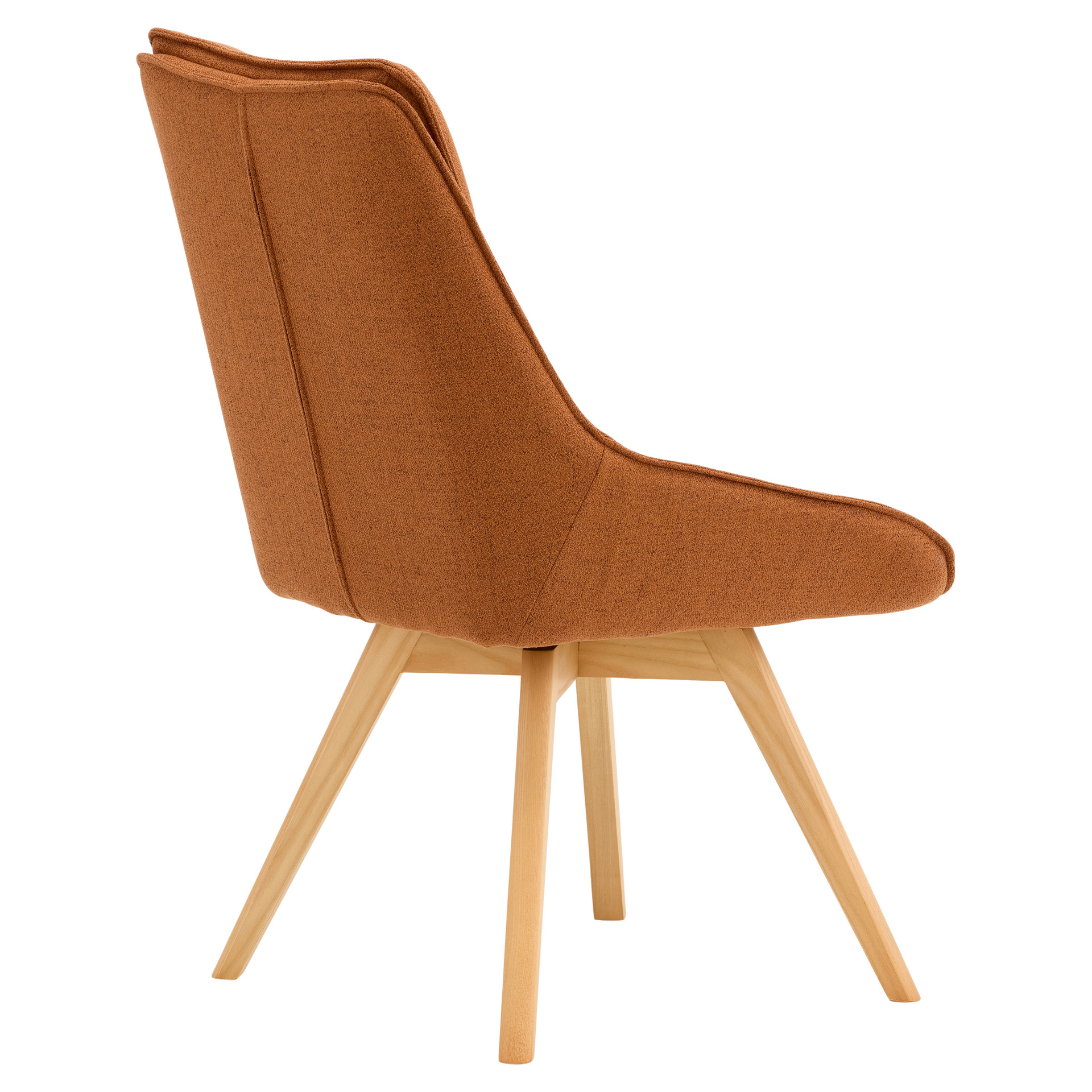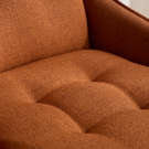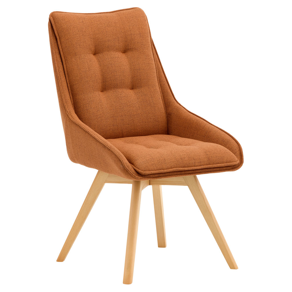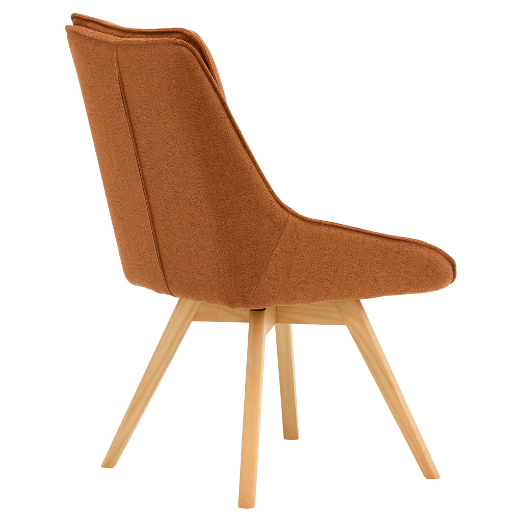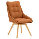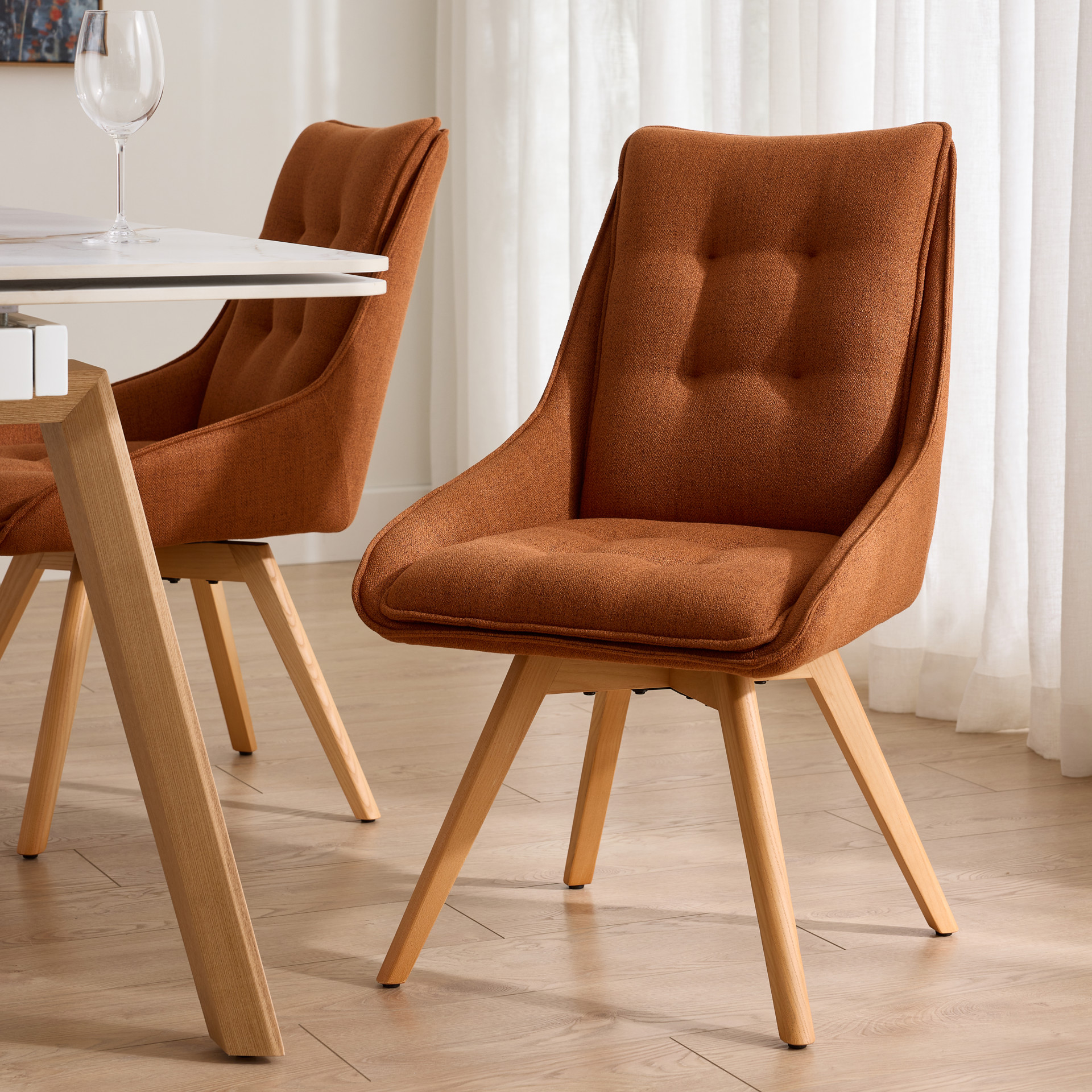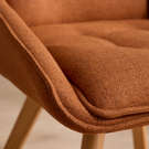 Contemporary design chairs upholstered in terracotta fabric with vertical tufted detailing.