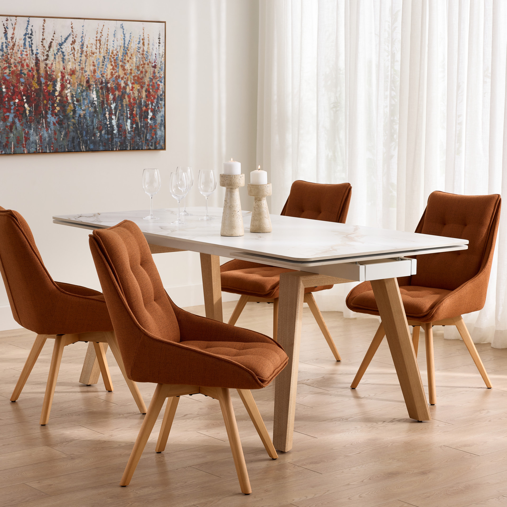 This collection blends the authenticity of natural wood with the sophistication of a white marble effect ceramic top. The rectangular table’s clean lines rest on a solid oak base, creating a harmonious contrast between noble materials.