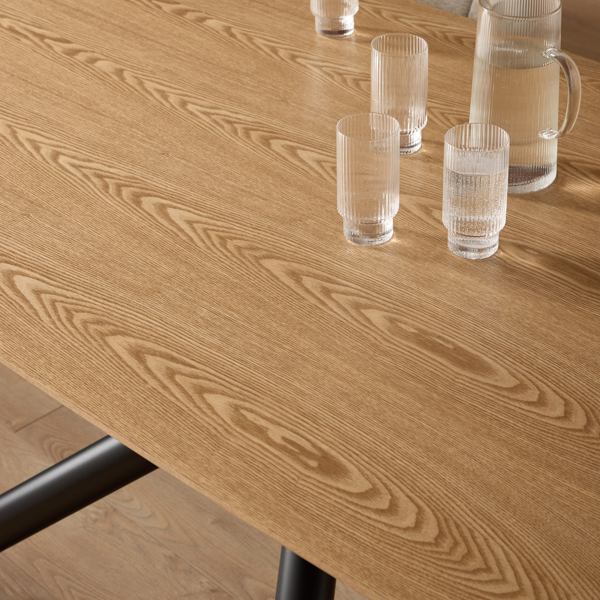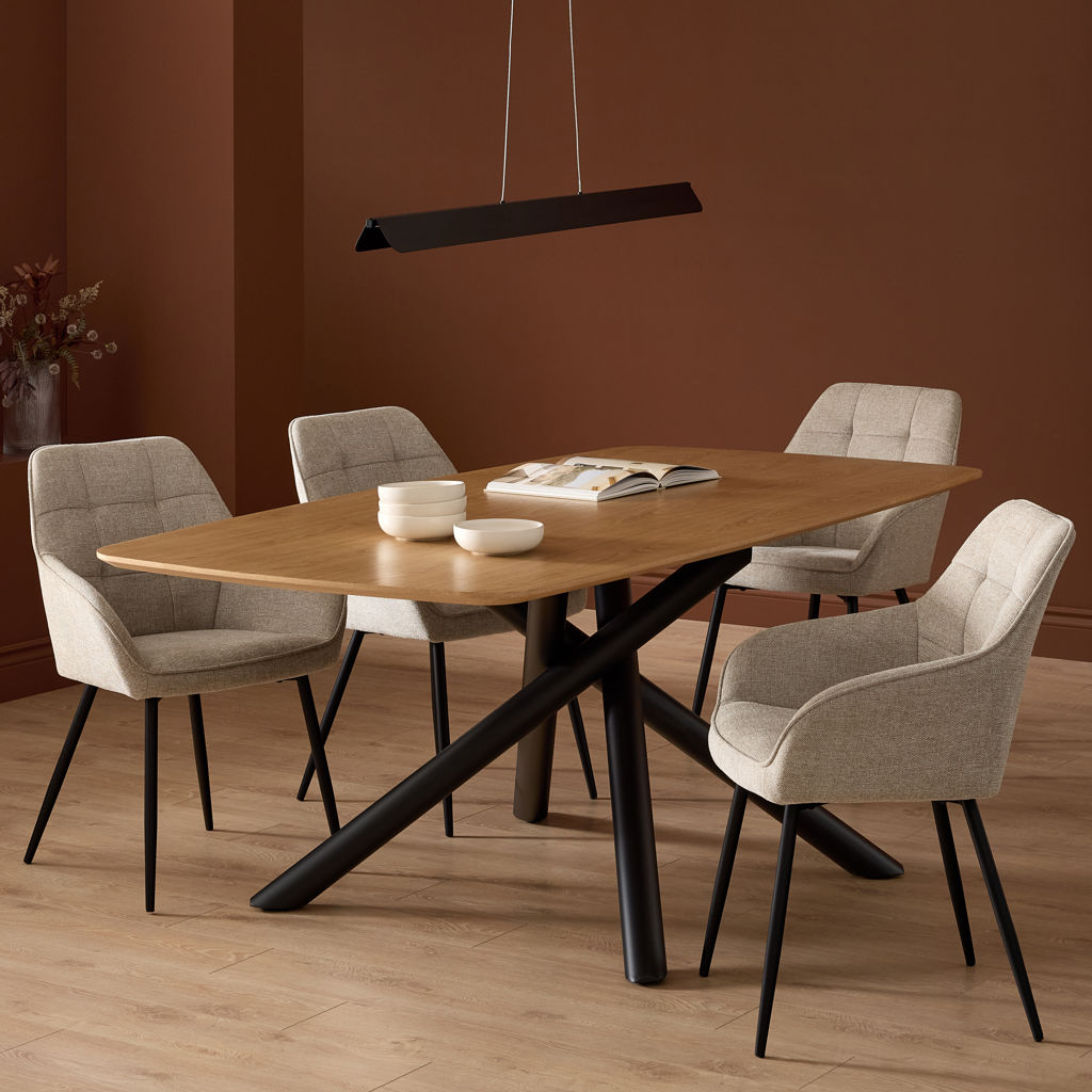 Transform your dining space with this complete set featuring a sophisticated contemporary design. The harmonious blend of warm natural wood, elegant fabric, and sleek black metal creates an atmosphere that is both welcoming and distinctly modern.