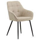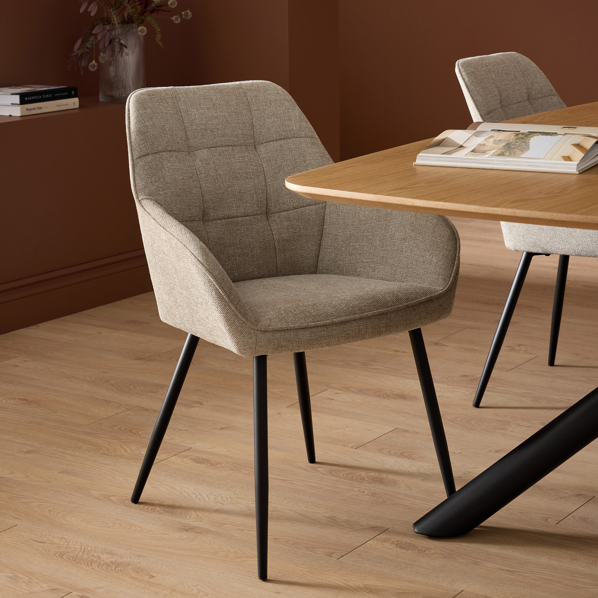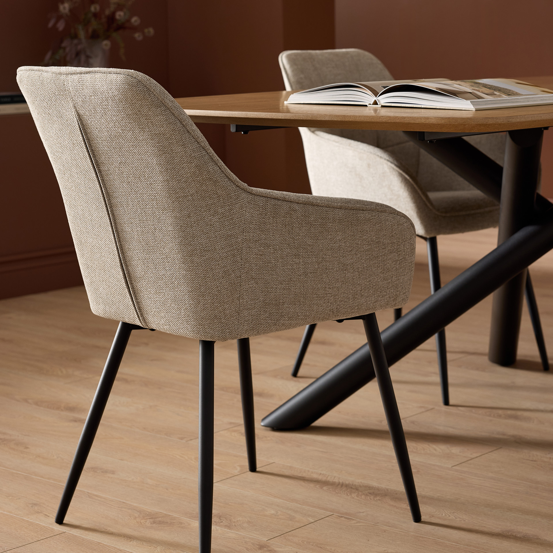 Their refined silhouette with integrated armrests combines visual sophistication with optimal comfort, making them ideal for long, relaxed meals. The soft fabric upholstery adds a warm, timeless touch, while the gently curved backrest naturally supports the body.