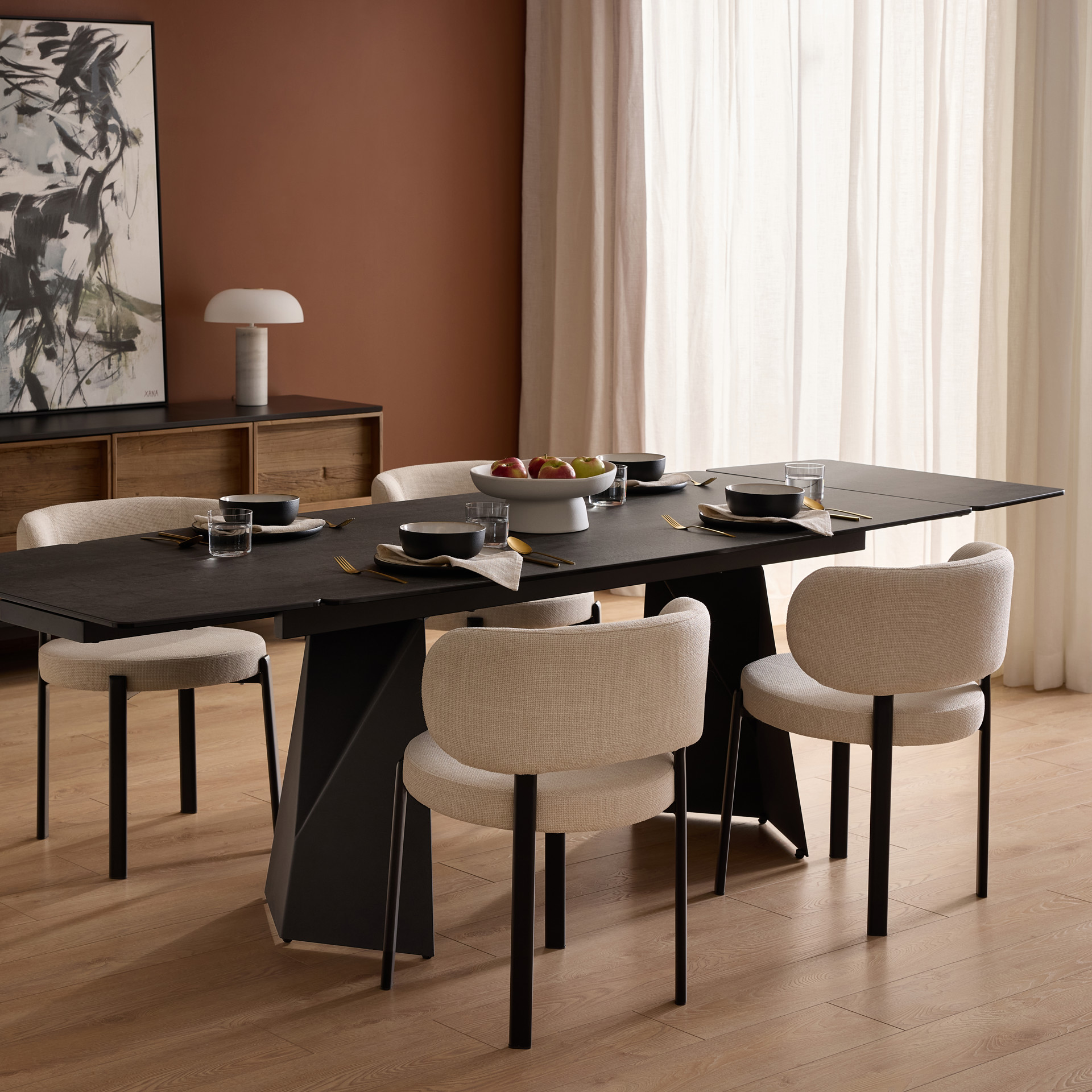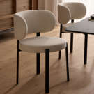 Its refined aesthetic combines the strength of black metal, the sophistication of a ceramic tabletop, and the softness of light fabric, creating an atmosphere that is both elegant and inviting.