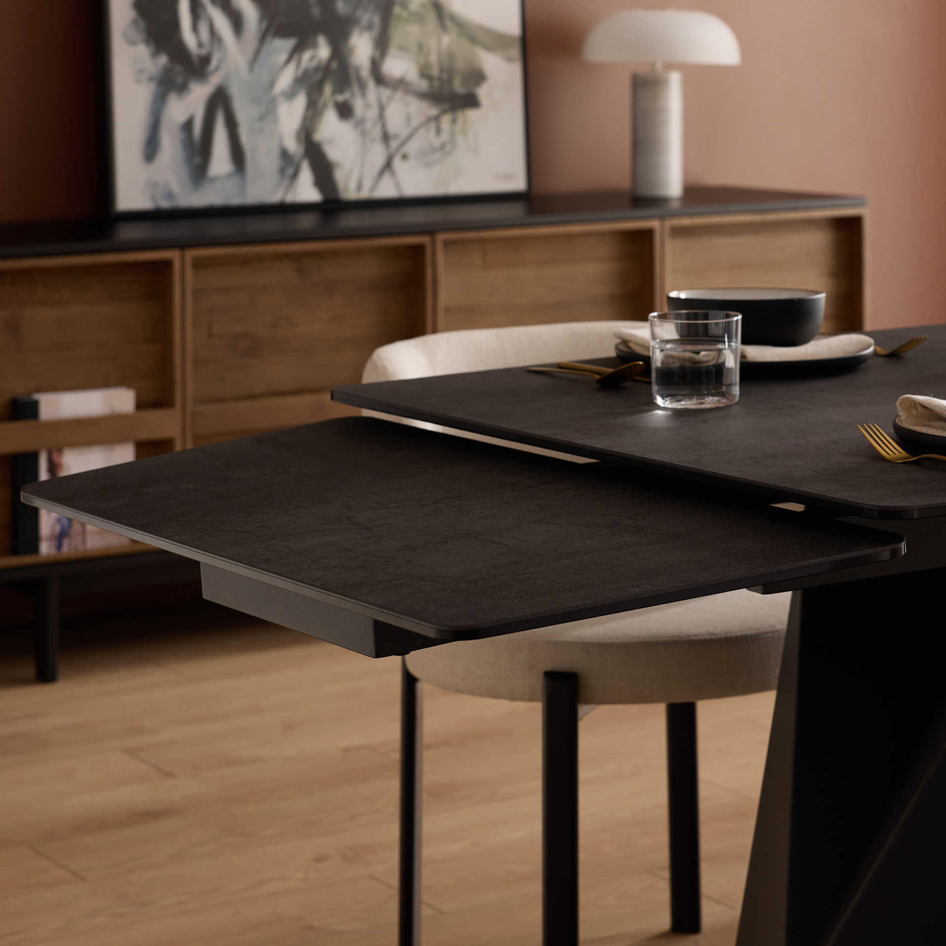 Designed to adapt to any space, it features two discreet manual extensions hidden beneath the tabletop, allowing you to effortlessly transition from intimate dinners to large gatherings.