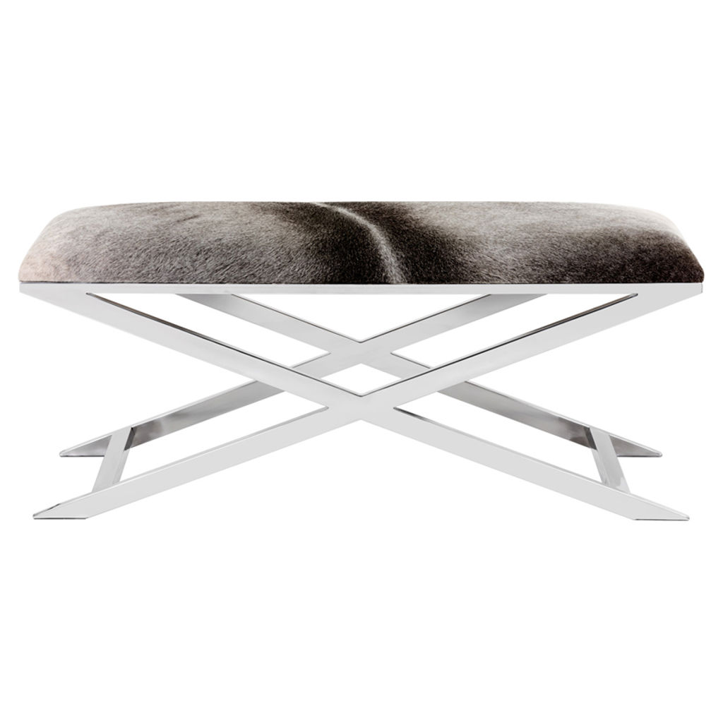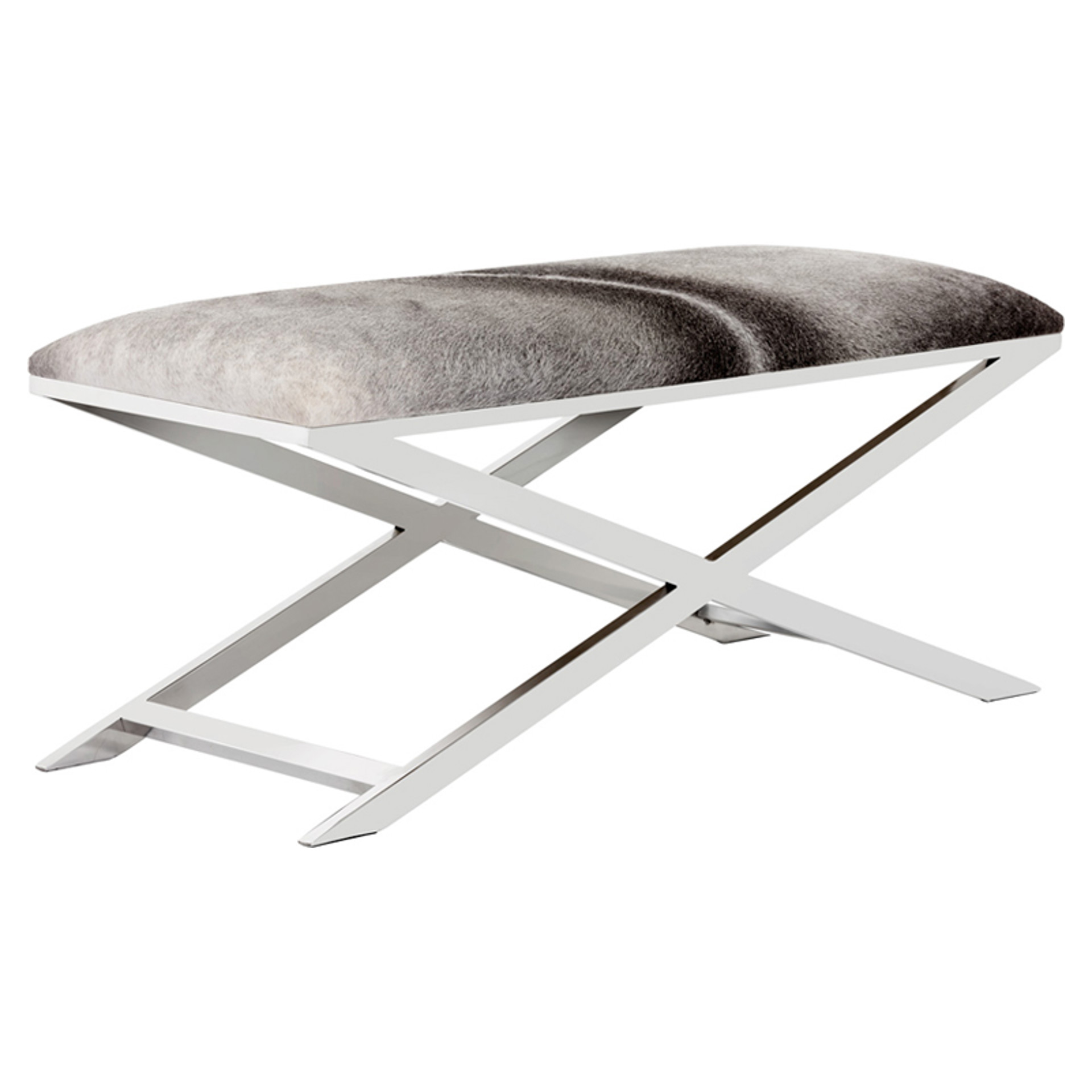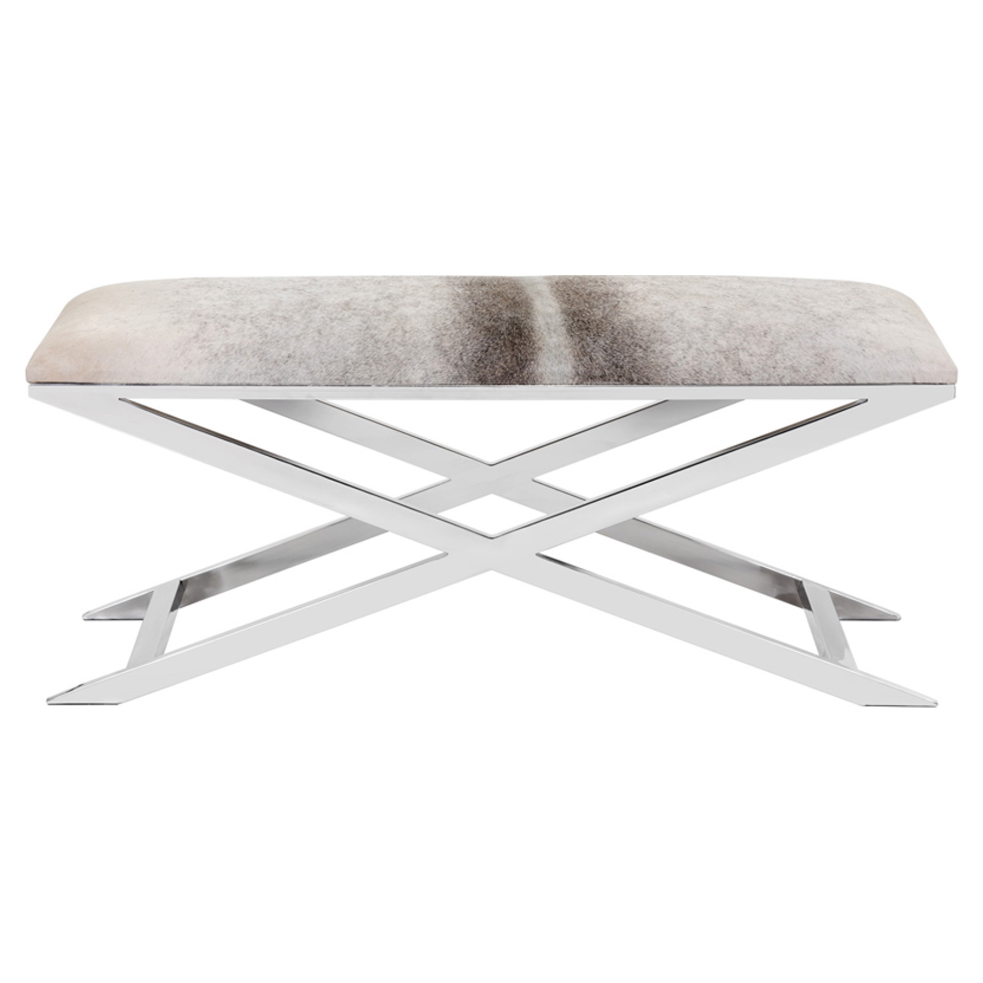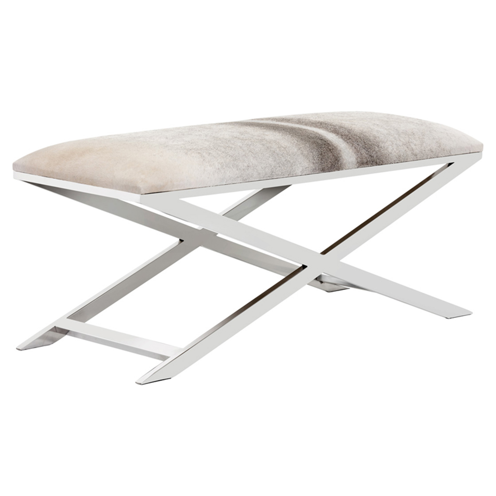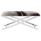 Made in India, the Sahara bench is beautifully unique as no two are alike. It features a stunning genuine cowhide seat in various shades of grey and brown with a polished stainless steel X-base. Ideal for commercial or residential use. Because cowhide is a natural material, no two pieces are the same and colours and/or patterns vary.