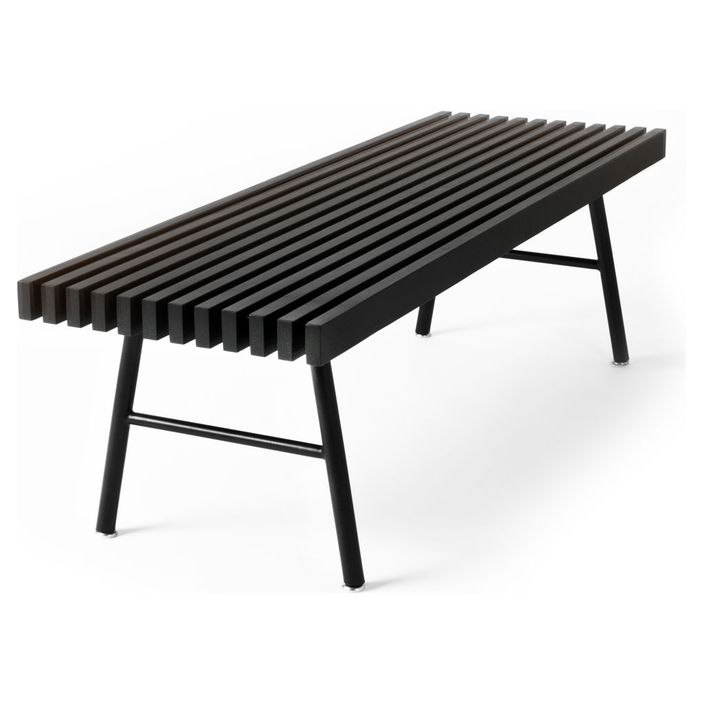 The Transit bench is a versatile design that can either be used as a seat for tight spaces like entryways and bedrooms, or as a coffee table. The surface, which creates a pleasing elemental pattern, is constructed with solid wood pieces that are precisely joined in parallel to create a sturdy yet lightweight design. The legs are slightly flared for stability and are made of powder-coated tubular steel. Available in natural ash with white legs or black ash with black legs. All wood is 100% FSC certified in support of responsible forest management.