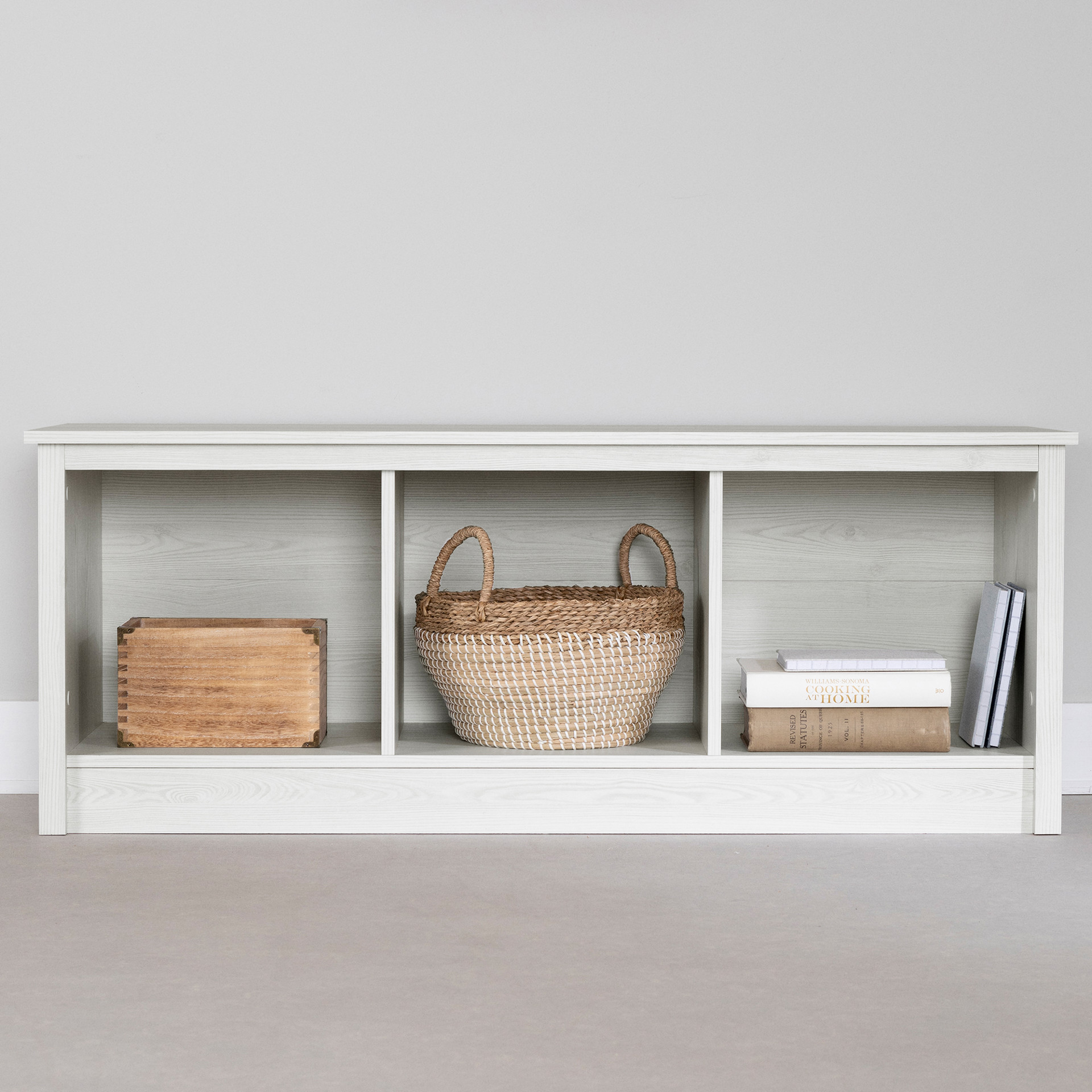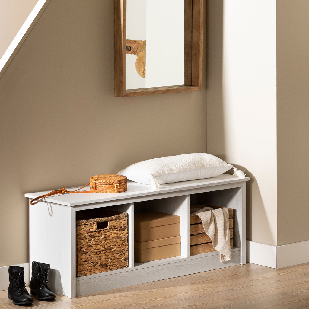 The Contemporary style of this mudroom bench will help create an inviting atmosphere in your home. The sleek design, with its open compartments and straight lines, will easily match your decor. Place baskets (not included) in the spaces under the seat and select original cushions for the top, to add a touch of originality. You’ll also have space on the wall above it for hooks or an inspiring work of art. Getting home will feel so good!