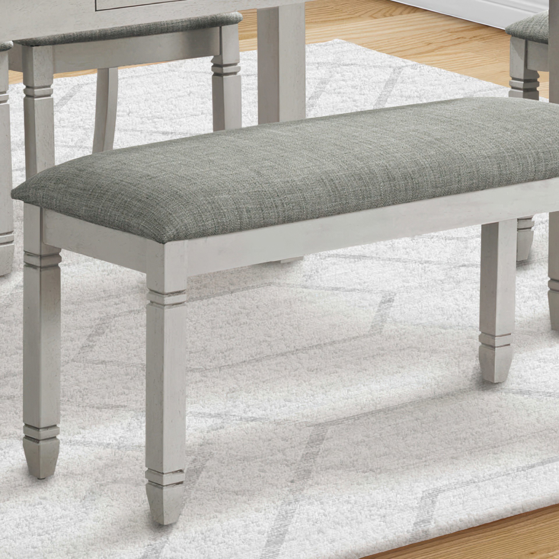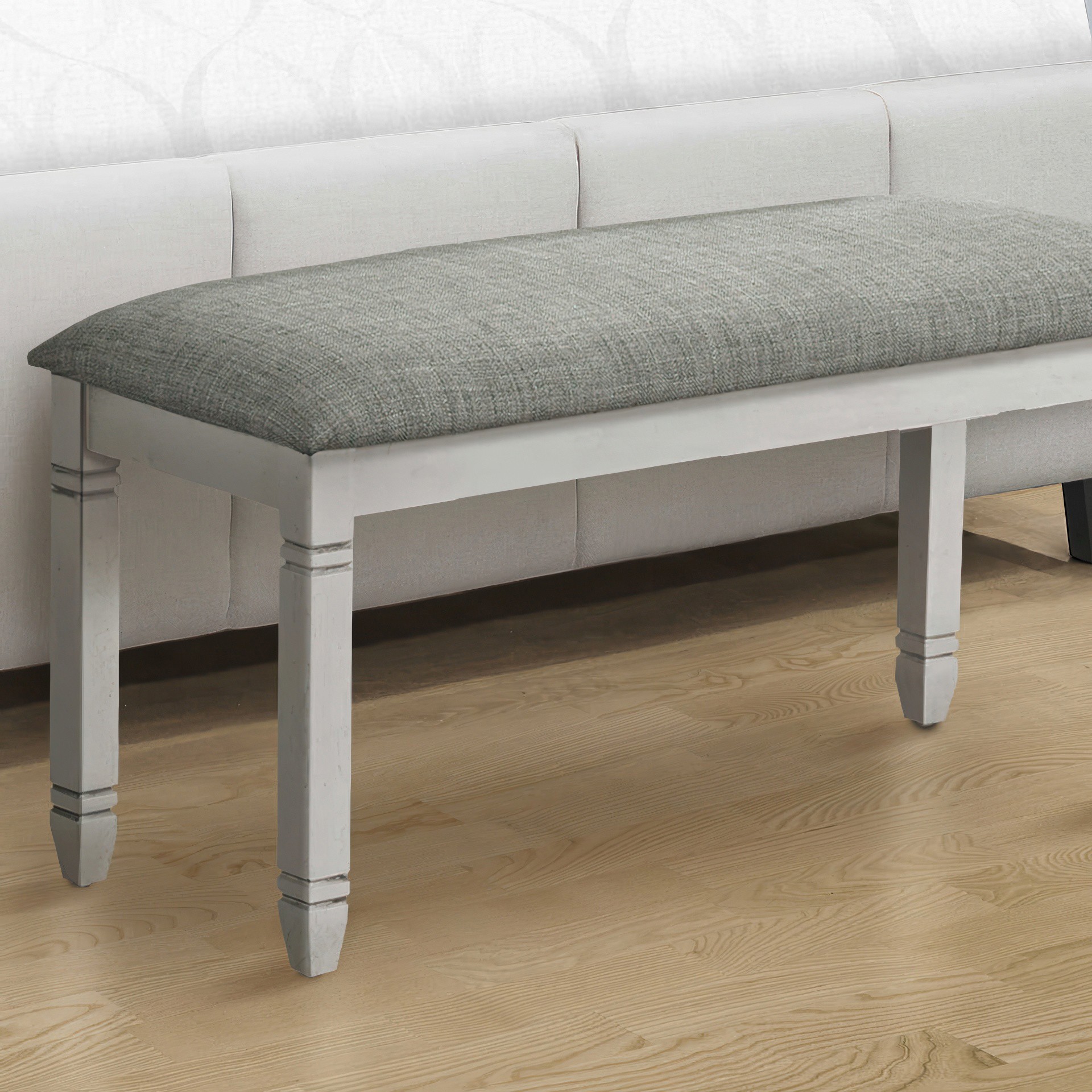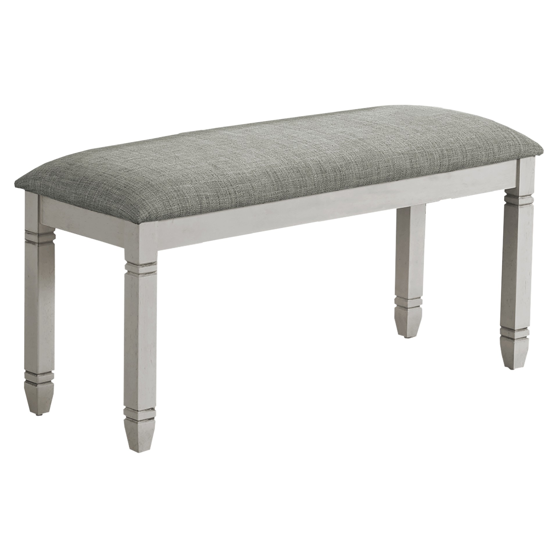 Elevate your living space with this comfortable and stylish 41" rectangular bench, finished in a chic grey. Durably designed, this practical bench features grey solid wood legs supporting a padded seat upholstered in a neutral linen-look grey fabric.
