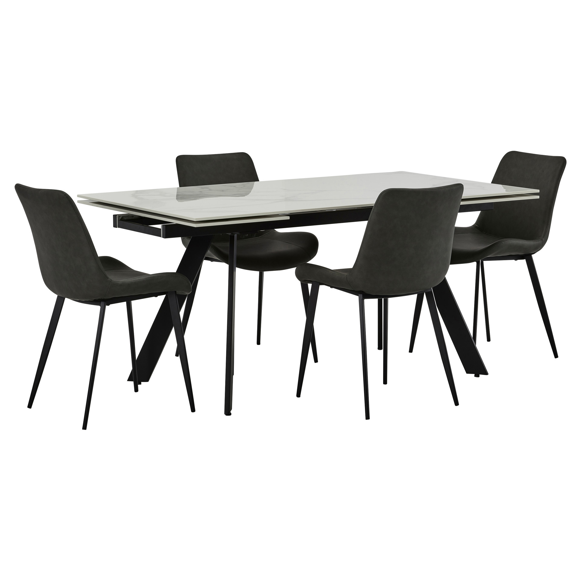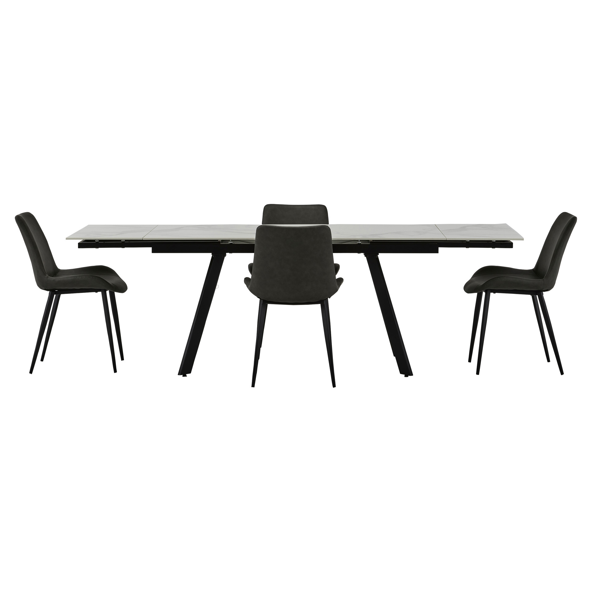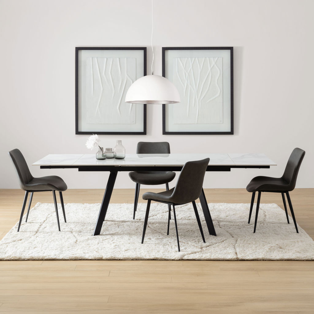 Bring design to the dining room with this artistic and functional contemporary extendable dining table and four side chairs. Featuring a 1/2" thick marbled ceramic rectangular top with two 16" sliding extensions, which opens to 94" for a larger surface area.