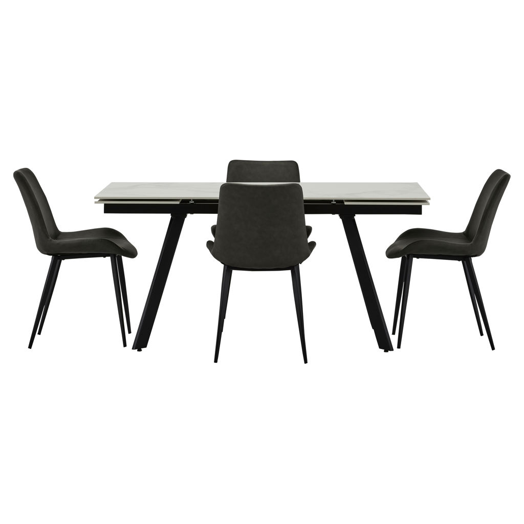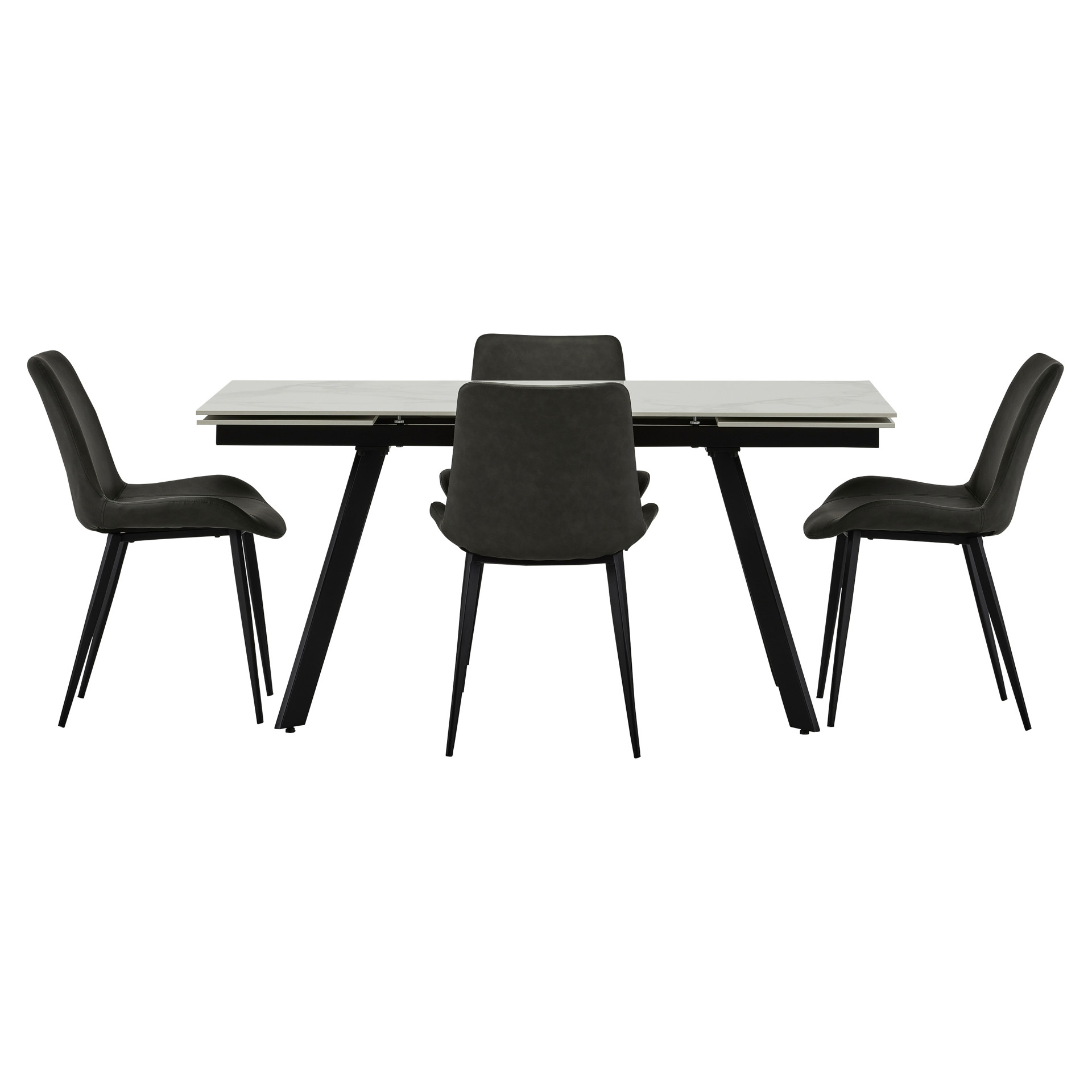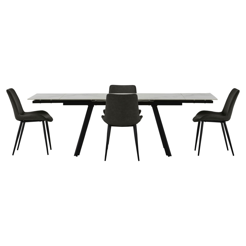 Bring design to the dining room with this artistic and functional contemporary extendable dining table and four side chairs. Featuring a 1/2" thick marbled ceramic rectangular top with two 16" sliding extensions, which opens to 94" for a larger surface area.