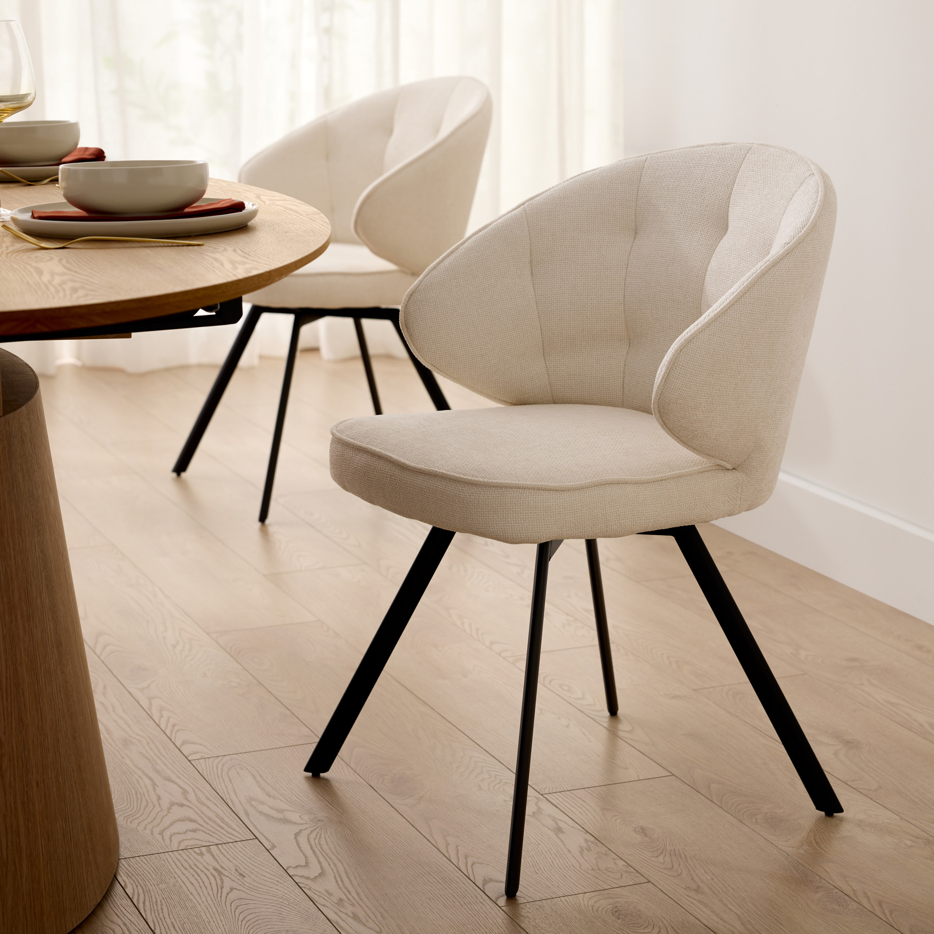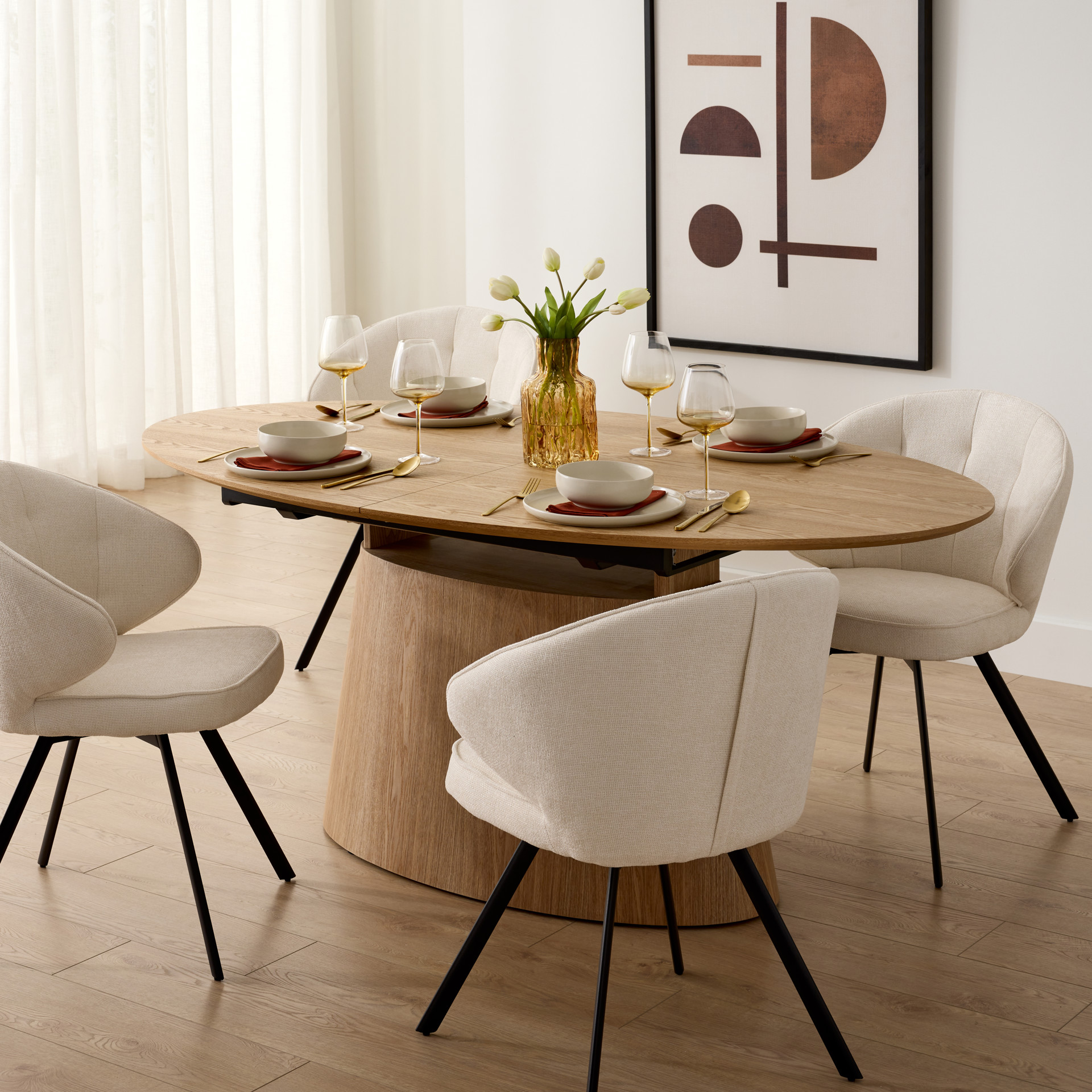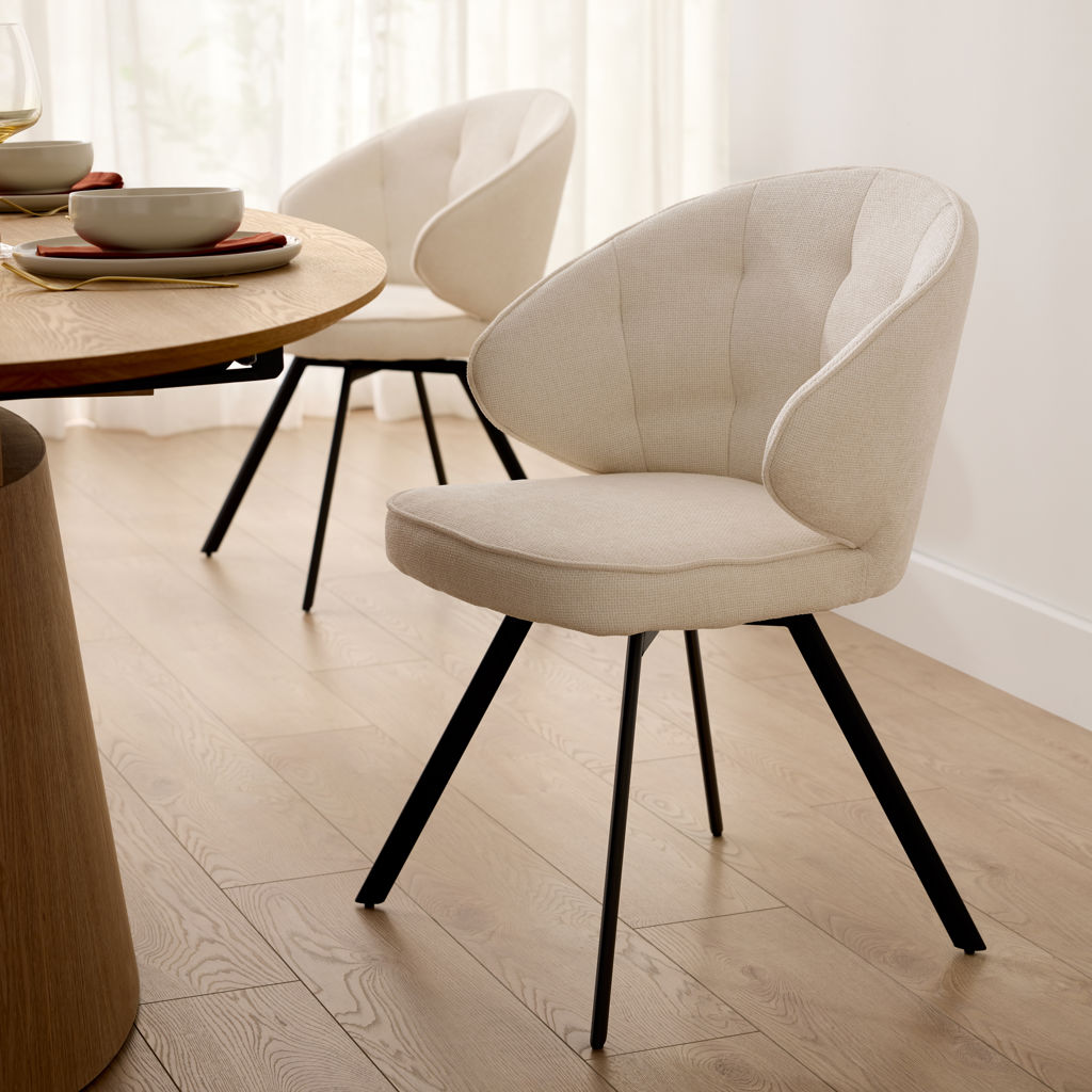 The chairs, upholstered in soft fabric, provide exceptional comfort and support for long, enjoyable meals. Their clean lines pair beautifully with the table, creating a soothing visual harmony. The black metal legs add a subtle touch of contrast for a contemporary finish.