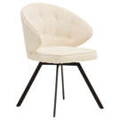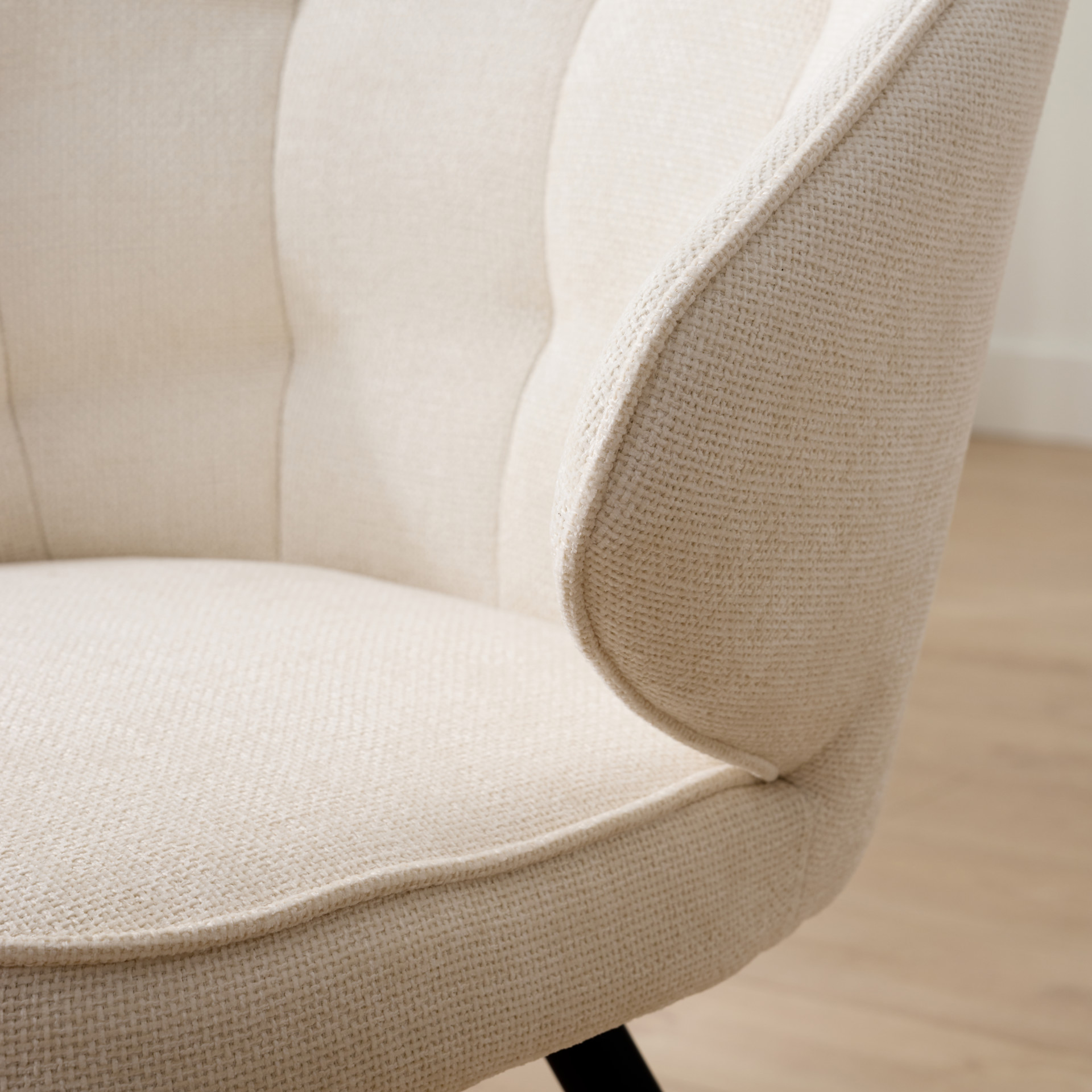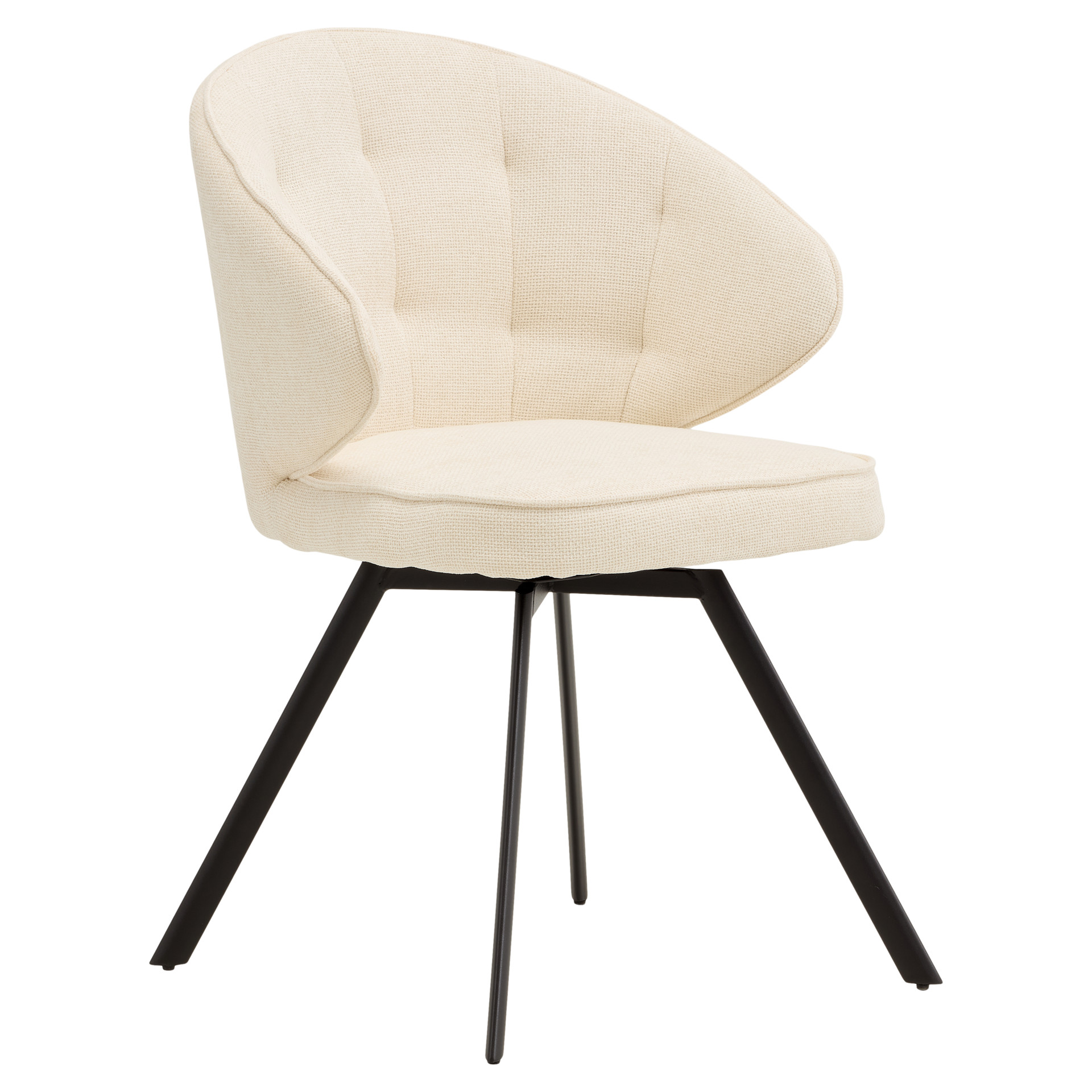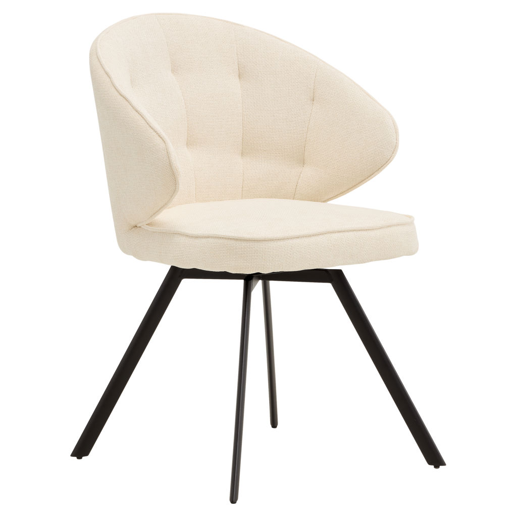 The chairs, upholstered in soft fabric, provide exceptional comfort and support for long, enjoyable meals. Their clean lines pair beautifully with the table, creating a soothing visual harmony. The black metal legs add a subtle touch of contrast for a contemporary finish.