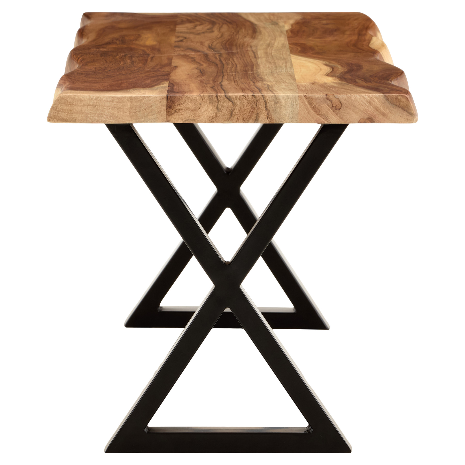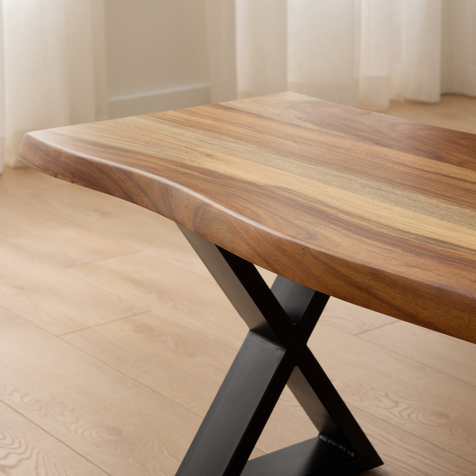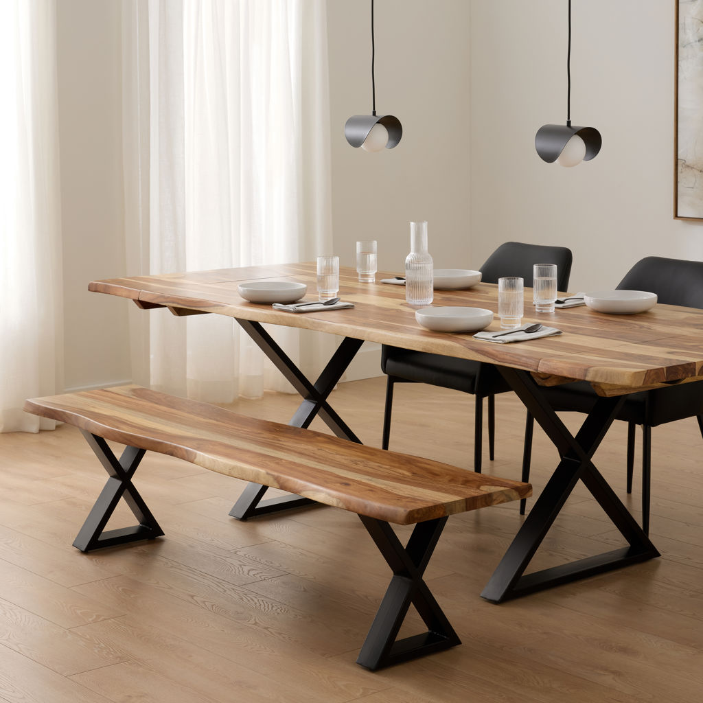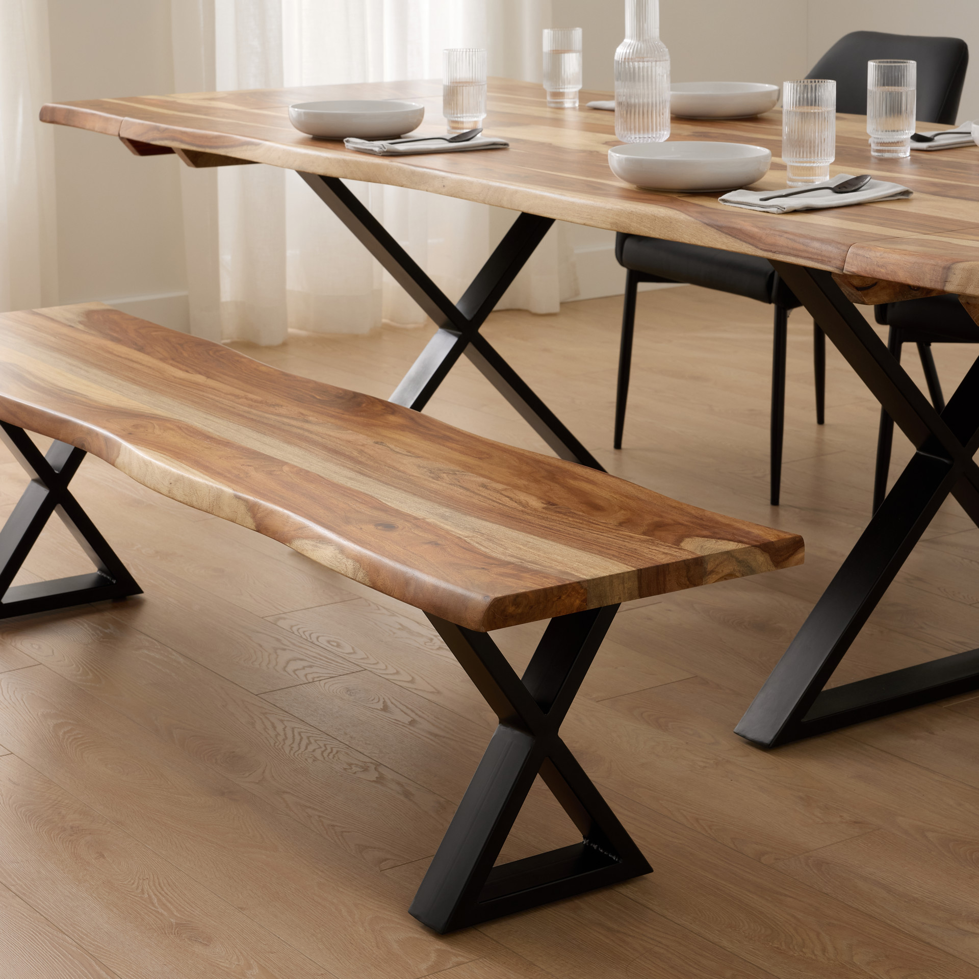Its solid sheesham wood seat with Live Edge trim highlights the warmth and authenticity of the material, while its black metal cross legs offer optimum stability and refined industrial style.