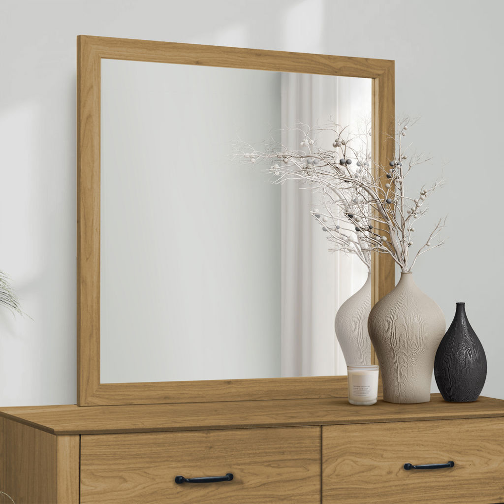 Featuring a stylish medium oak laminate finish, this square mirror brings a fresh and inviting feel to your space. Delivered fully assembled and ready to enhance your décor, this versatile mirror can also be mounted to the matching dresser (sold separately), as the attachment brackets are included for quick and easy installation.