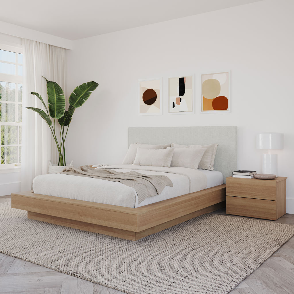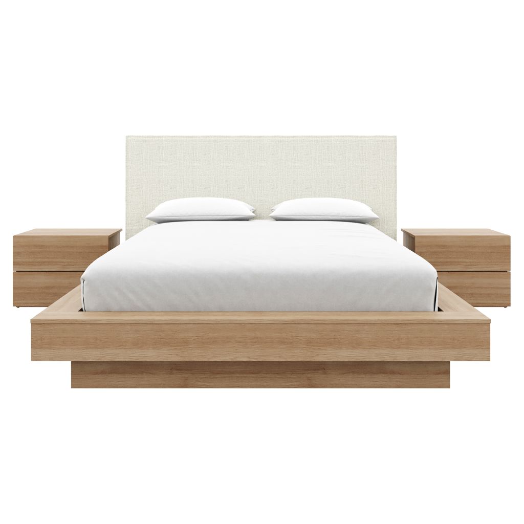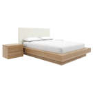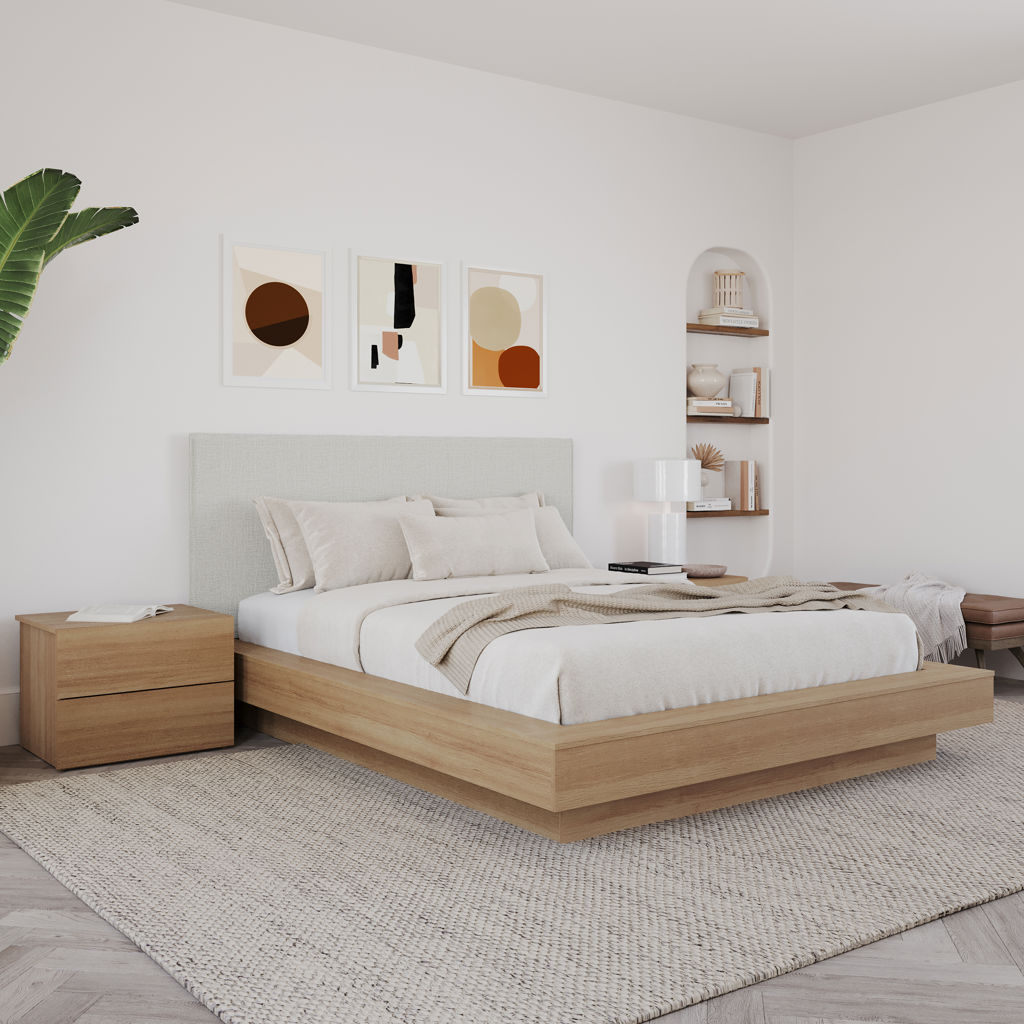The sleek oak-finish nightstands complete the look, combining comfort, elegance, and convenient storage for your essentials.