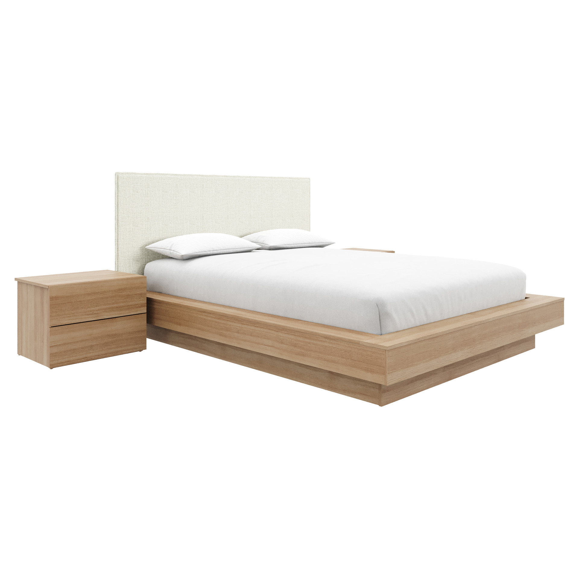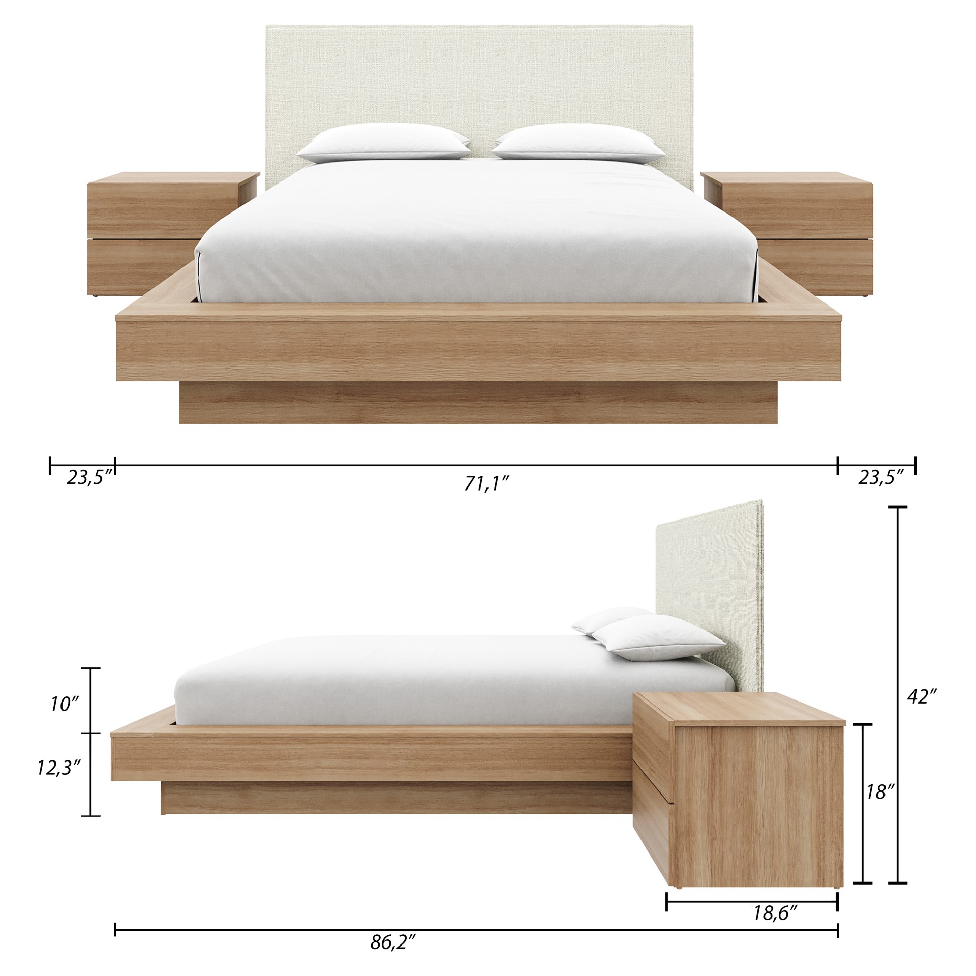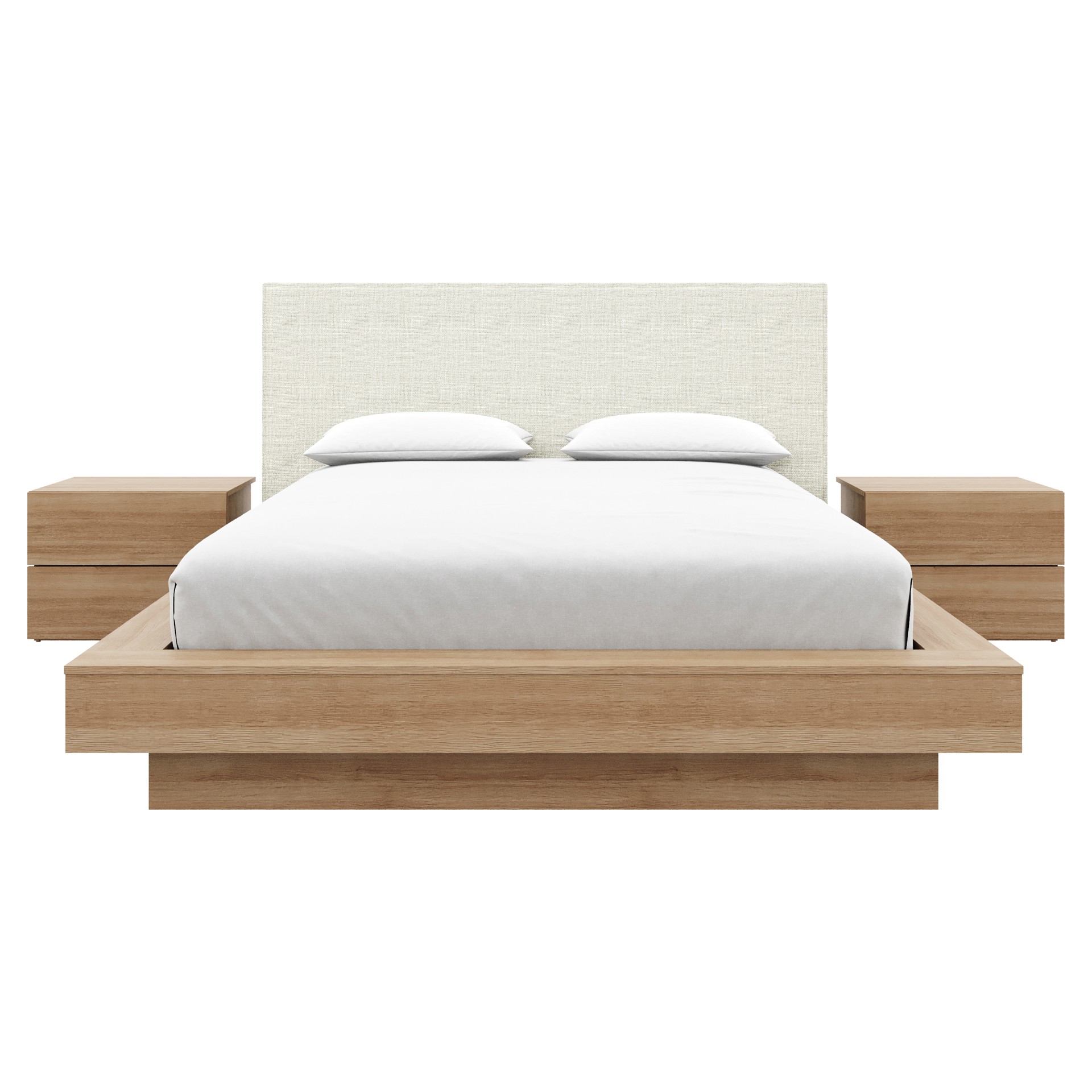 The sleek oak-finish nightstands complete the look, combining comfort, elegance, and convenient storage for your essentials.